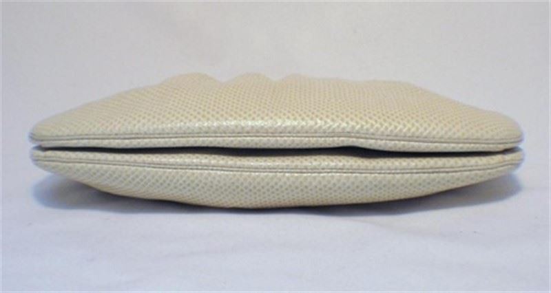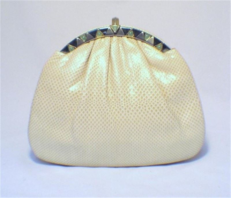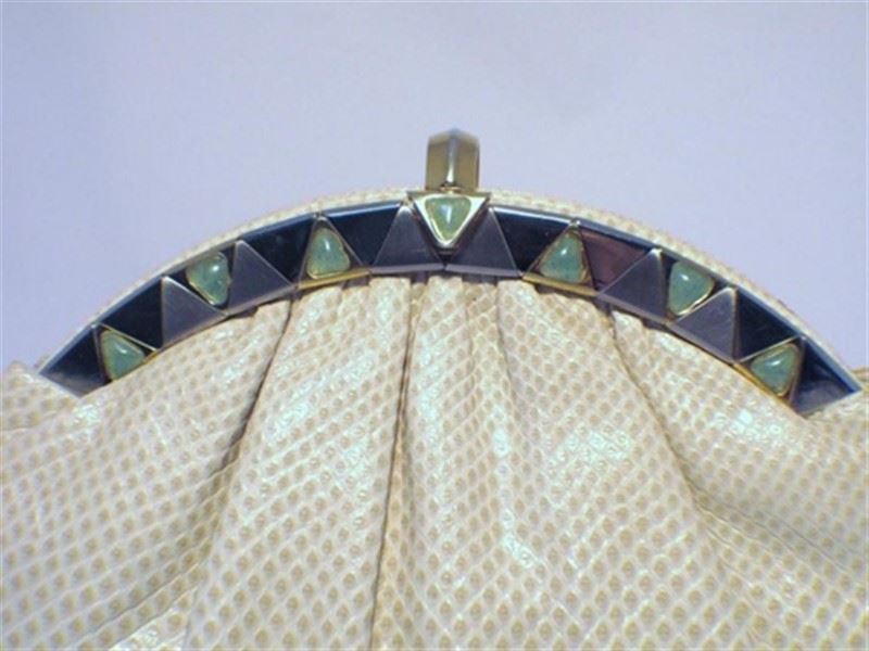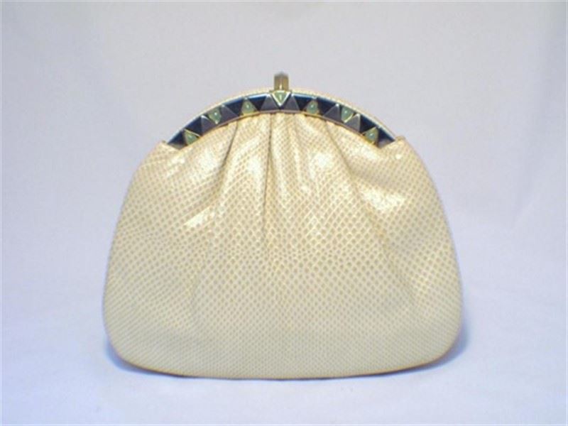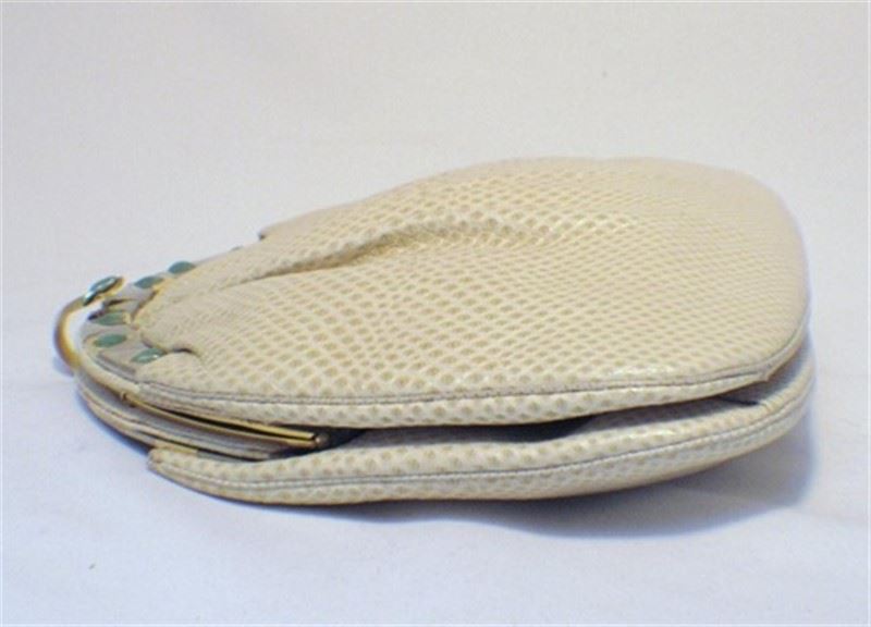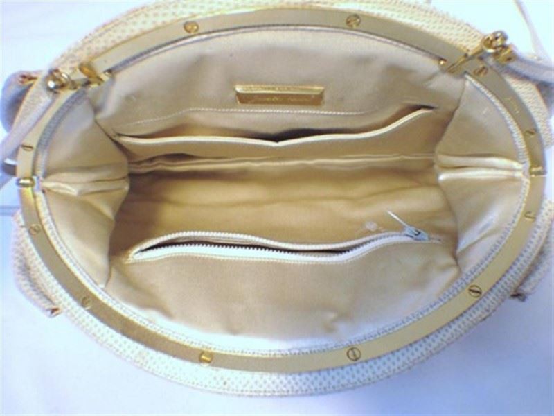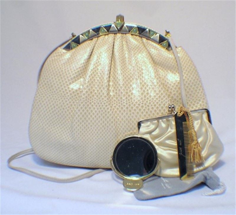 This adorable collector’s bag is the perfect addition to any wardrobe. With classic Judith Leiber detailing and beautiful beige lizard leather, this purse is sure to be a staple accessory of your wardrobe for years to come. The exterior is in mint condition featuring pristine lizard leather accented with silver, gold, and stone trimmed hardware. The interior is in perfect condition and fully lined with beige satin featuring one zippered pocket and one slit pocket. This bag has accessories of its own and includes the signature Judith Leiber travel sized gold comb, 3’’ pocket mirror, and 4.5’’x4’’ satin change purse. Purchase includes a dust cover. Measurements: 10.5’’x8.5’’x2.5’’ #bags128
