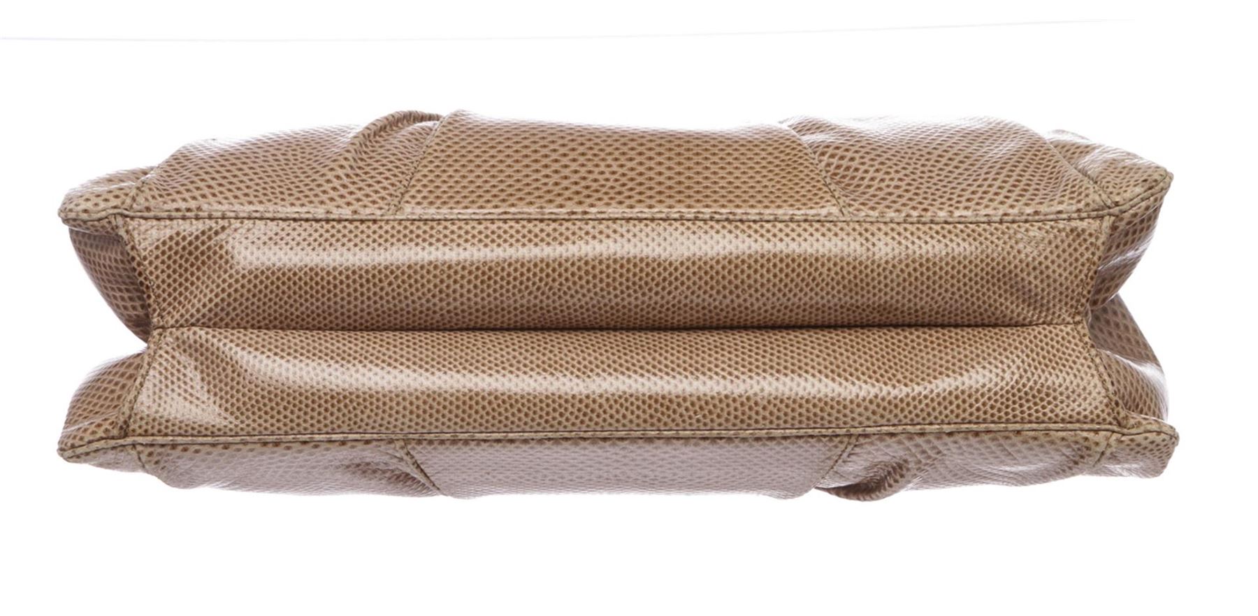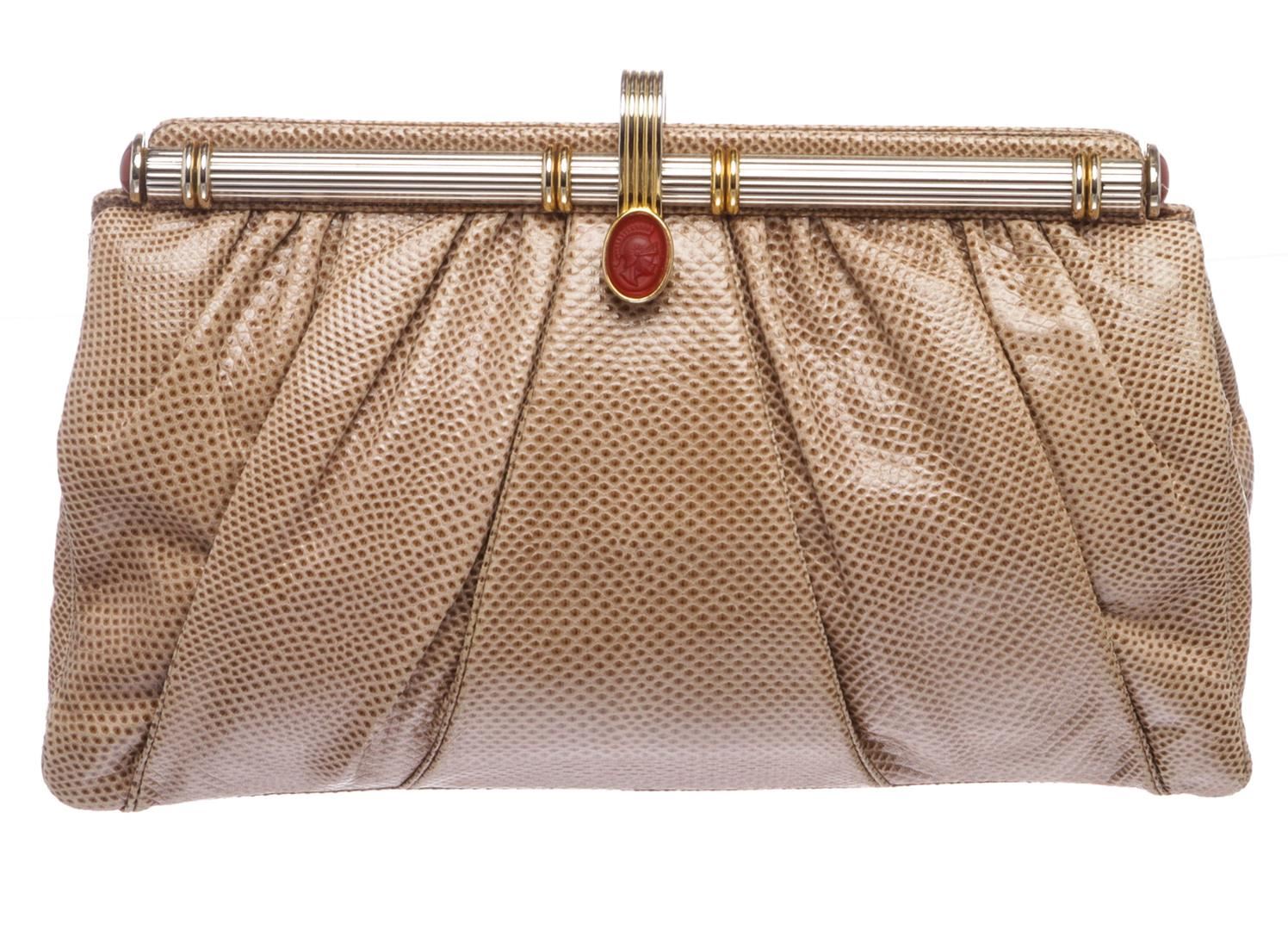 Overall flap snap closure. Interior is fabric lined with one slip pocket and one zipper pocket. Exterior contains gold and silver-tone embellishment. Includes strap.