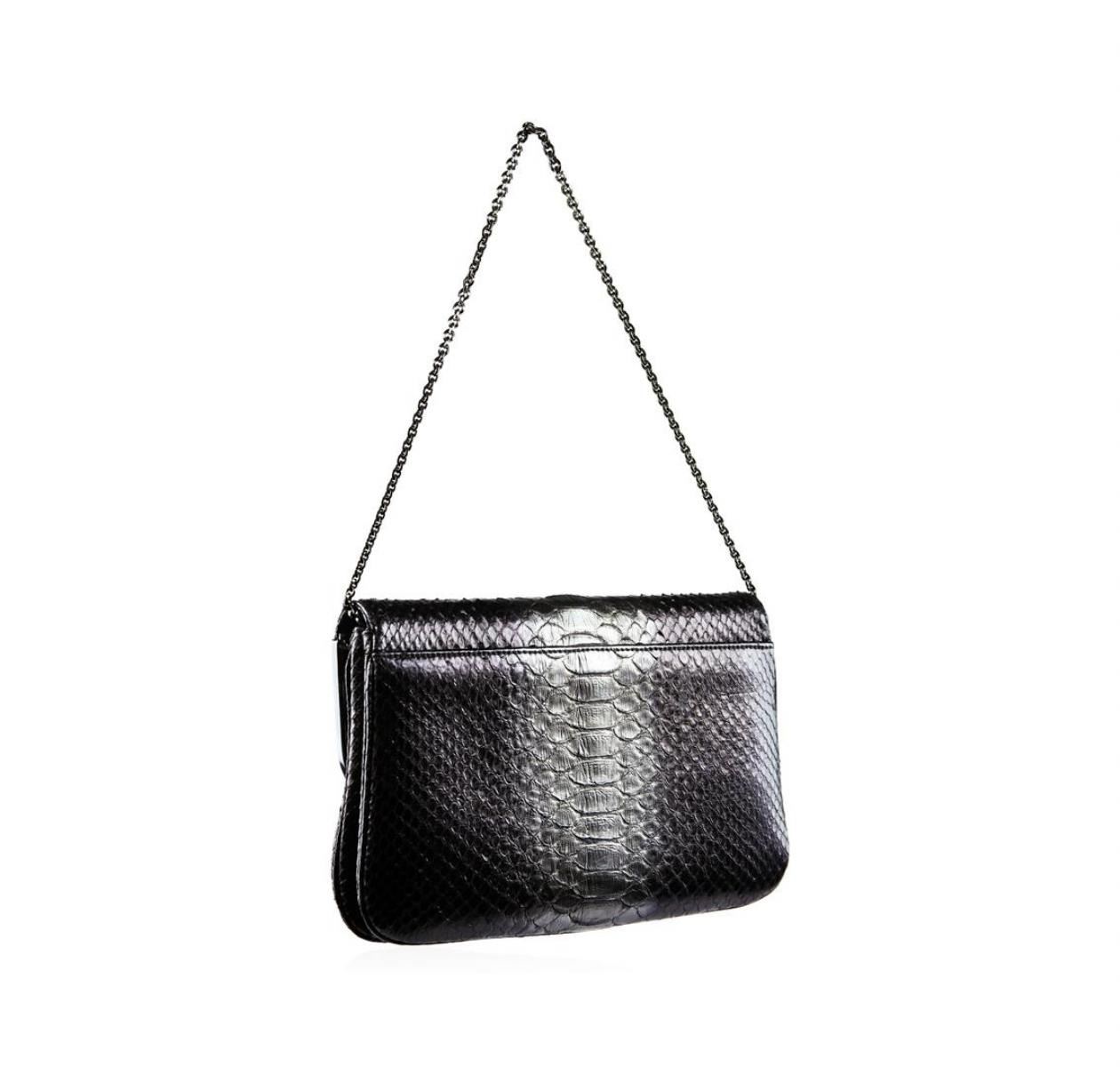 This Judith Leiber snakeskin evening bag can be carried with a metal chain or as a beautiful clutch. This bad measures 8"x 5.5 x 1". It is the perfect size to carry a cell phone, keys and other small items. A must have this season. Comes with authentic Judith Leiber dust bag.