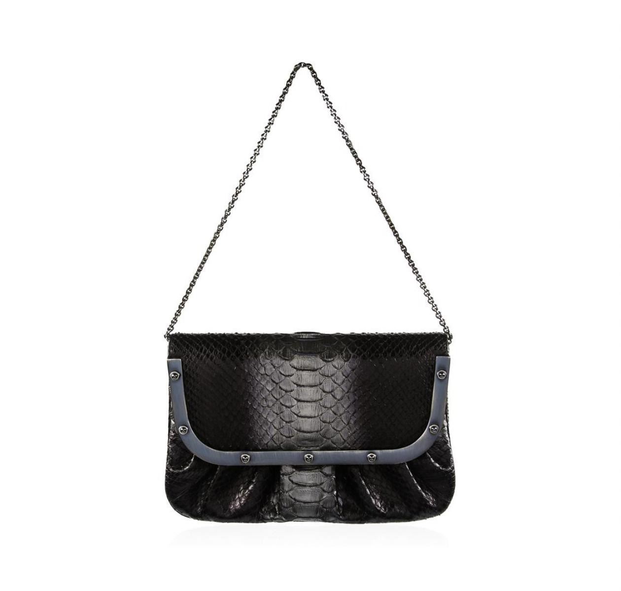 This Judith Leiber snakeskin evening bag can be carried with a metal chain or as a beautiful clutch. This bad measures 8"x 5.5 x 1". It is the perfect size to carry a cell phone, keys and other small items. A must have this season. Comes with authentic Judith Leiber dust bag.