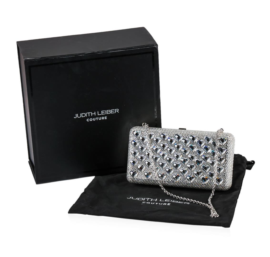 This NEW Judith Leiber Couture Crystal Minaudiere evening bag comes with its original box and dust bag. The bag features stunning clear crystals with hearts. The bag measures 6.5" x 3.75" x 1.5" and can be converted from a clutch to a bag with chain.