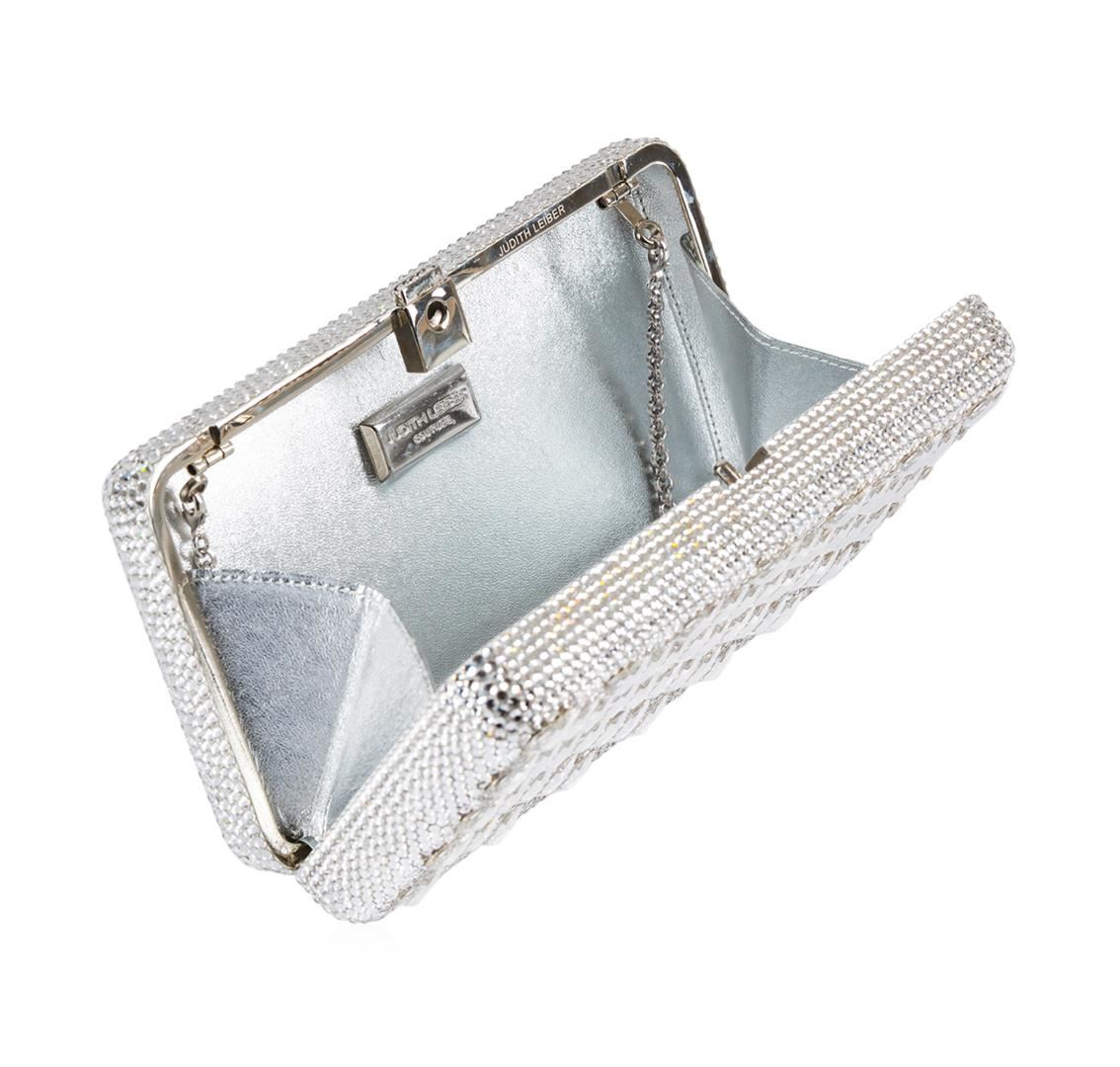 This NEW Judith Leiber Couture Crystal Minaudiere evening bag comes with its original box and dust bag. The bag features stunning clear crystals with hearts. The bag measures 6.5" x 3.75" x 1.5" and can be converted from a clutch to a bag with chain.