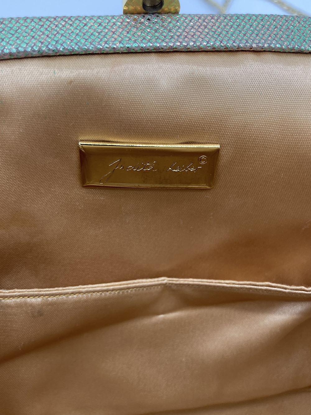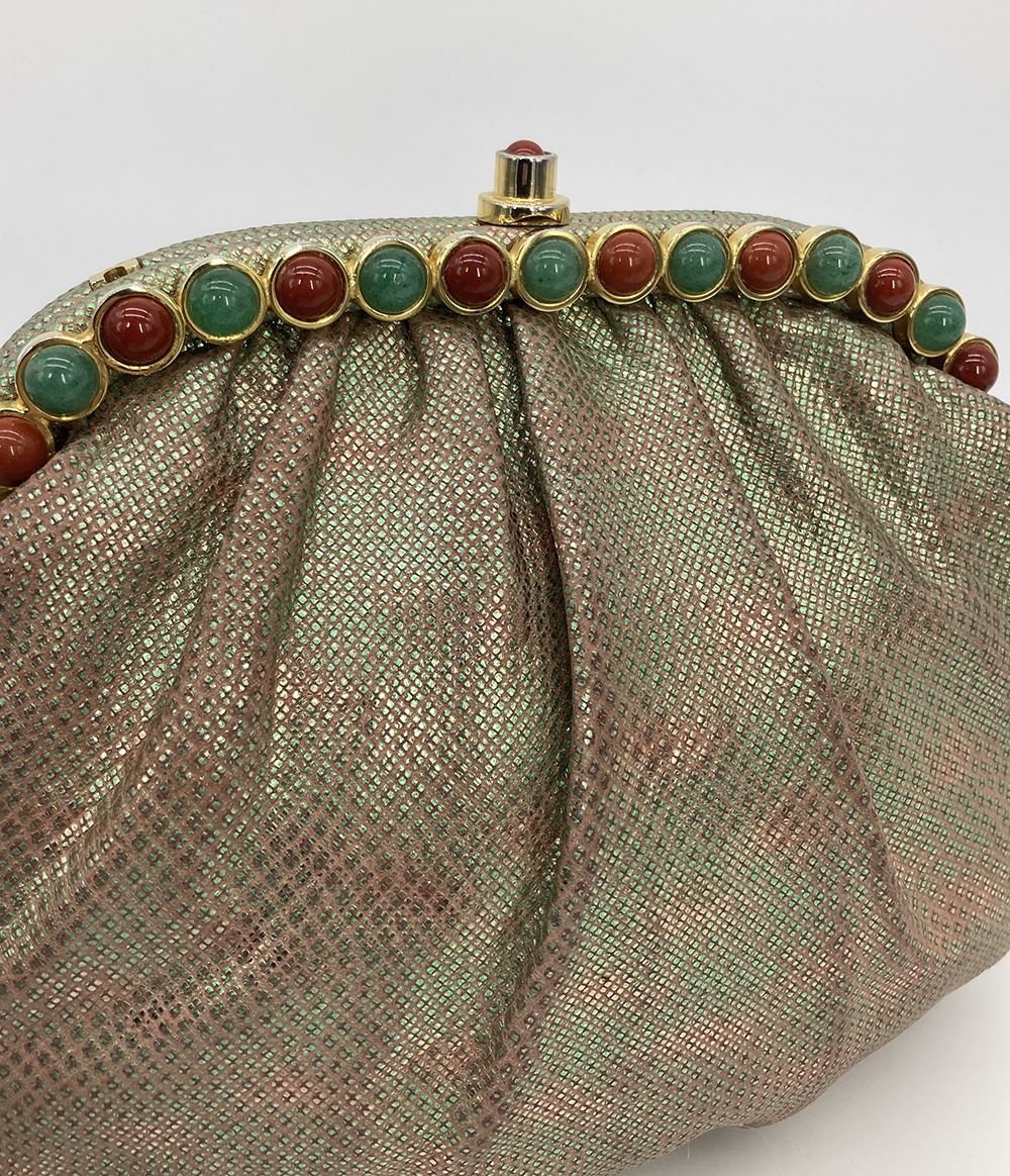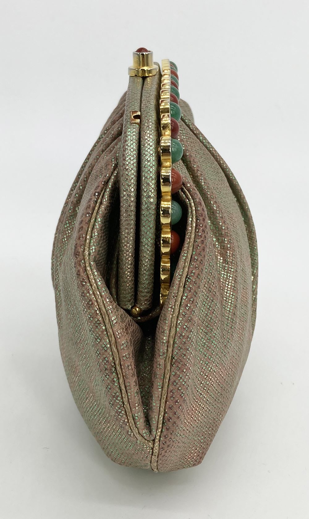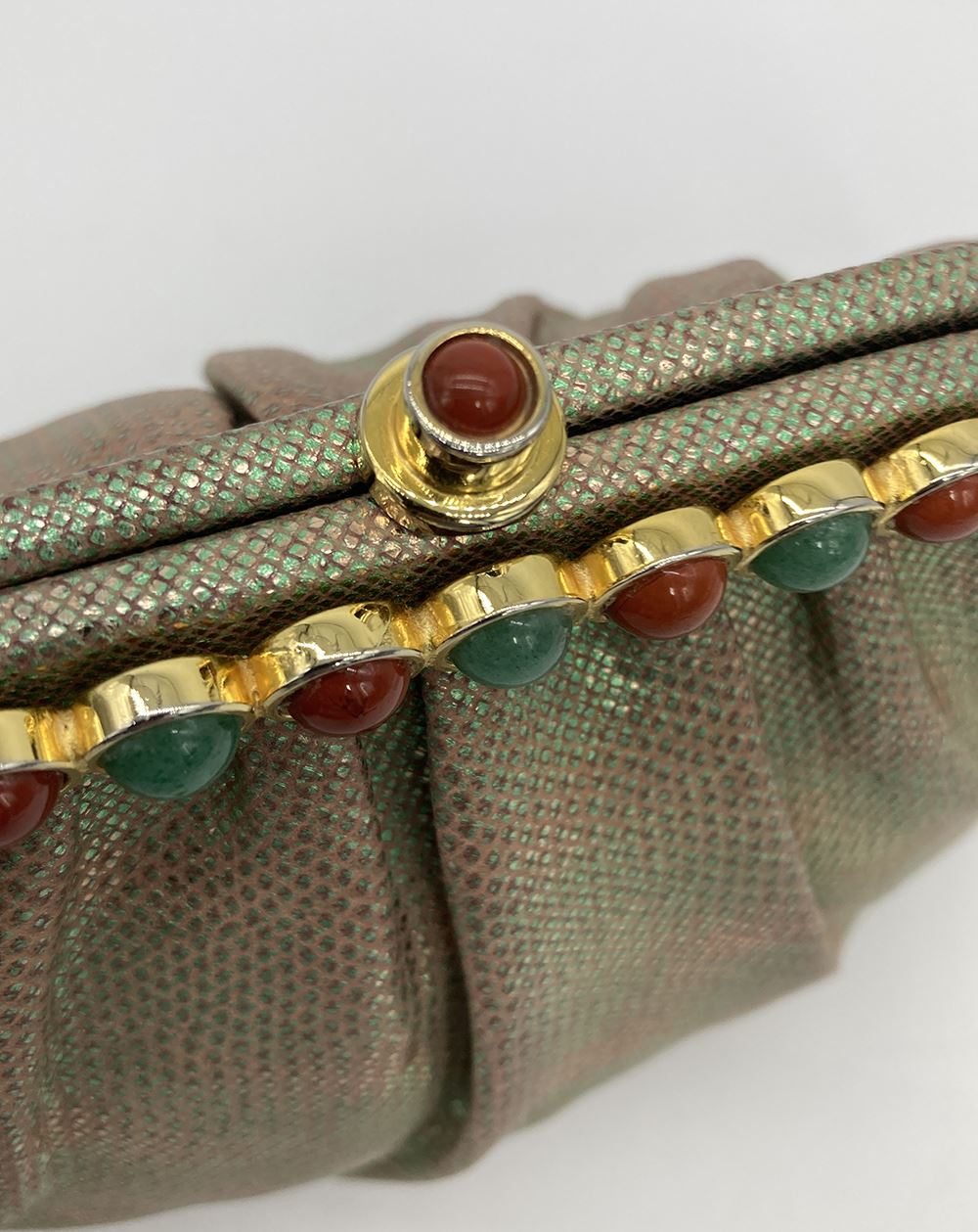 Judith Leiber Pink and Green Metallic Lizard Clutch in excellent condition. Pink and green metallic lizard exterior trimmed with gold hardware and red and green gemstones along top edge. Top lift latch closure opens to a light tan satin interior with one side slit pocket. Attached gold chain shoulder strap easily converts between clutch and shoulder styles. Overall excellent condition. no stains smells or scuffs. clean corners edges and interior. very light tarnishing on gold hardware- see photos for detail. purchase includes matching satin coin purse. measurements: 8.5"x6"x3" 19.5" strap drop #Bags3004