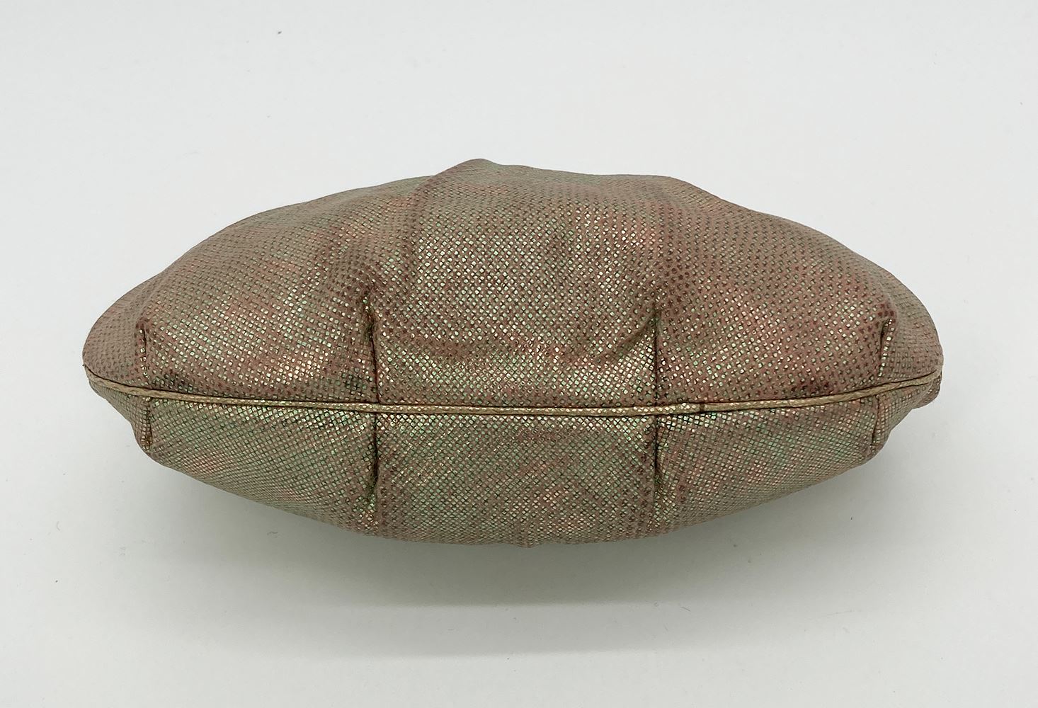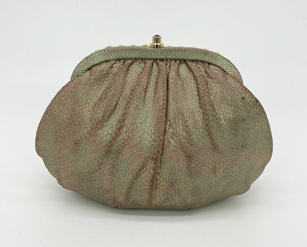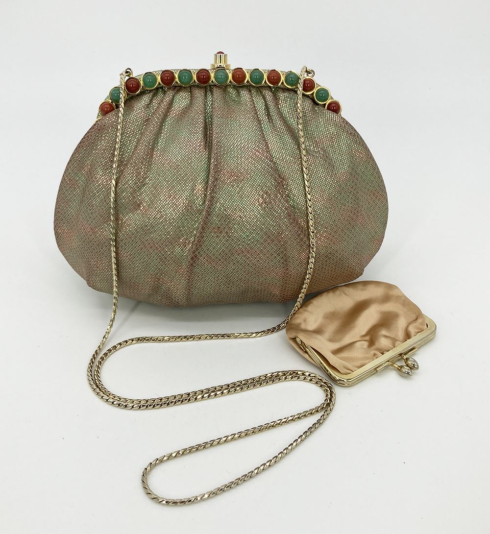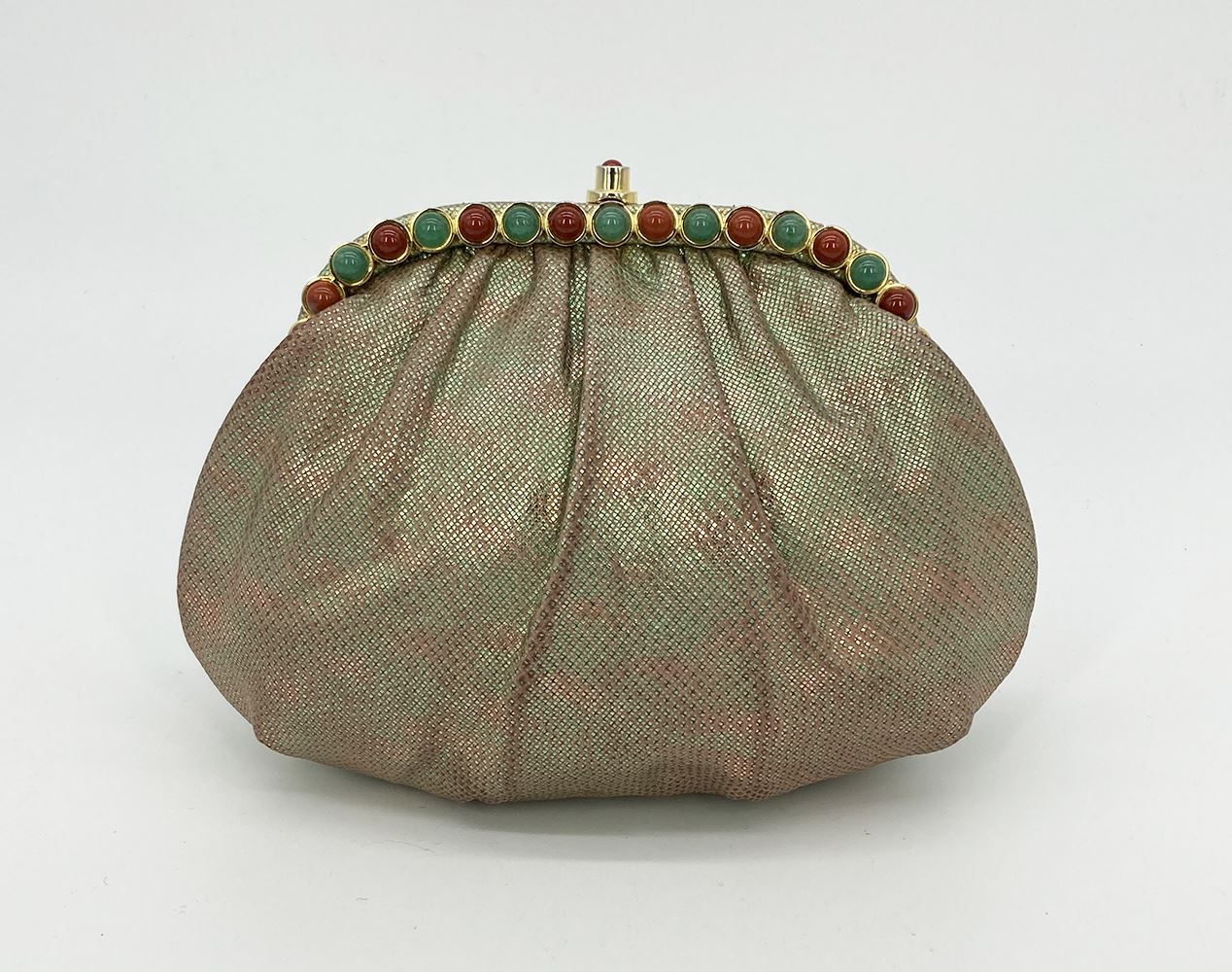 Judith Leiber Pink and Green Metallic Lizard Clutch in excellent condition. Pink and green metallic lizard exterior trimmed with gold hardware and red and green gemstones along top edge. Top lift latch closure opens to a light tan satin interior with one side slit pocket. Attached gold chain shoulder strap easily converts between clutch and shoulder styles. Overall excellent condition. no stains smells or scuffs. clean corners edges and interior. very light tarnishing on gold hardware- see photos for detail. purchase includes matching satin coin purse. measurements: 8.5"x6"x3" 19.5" strap drop #Bags3004