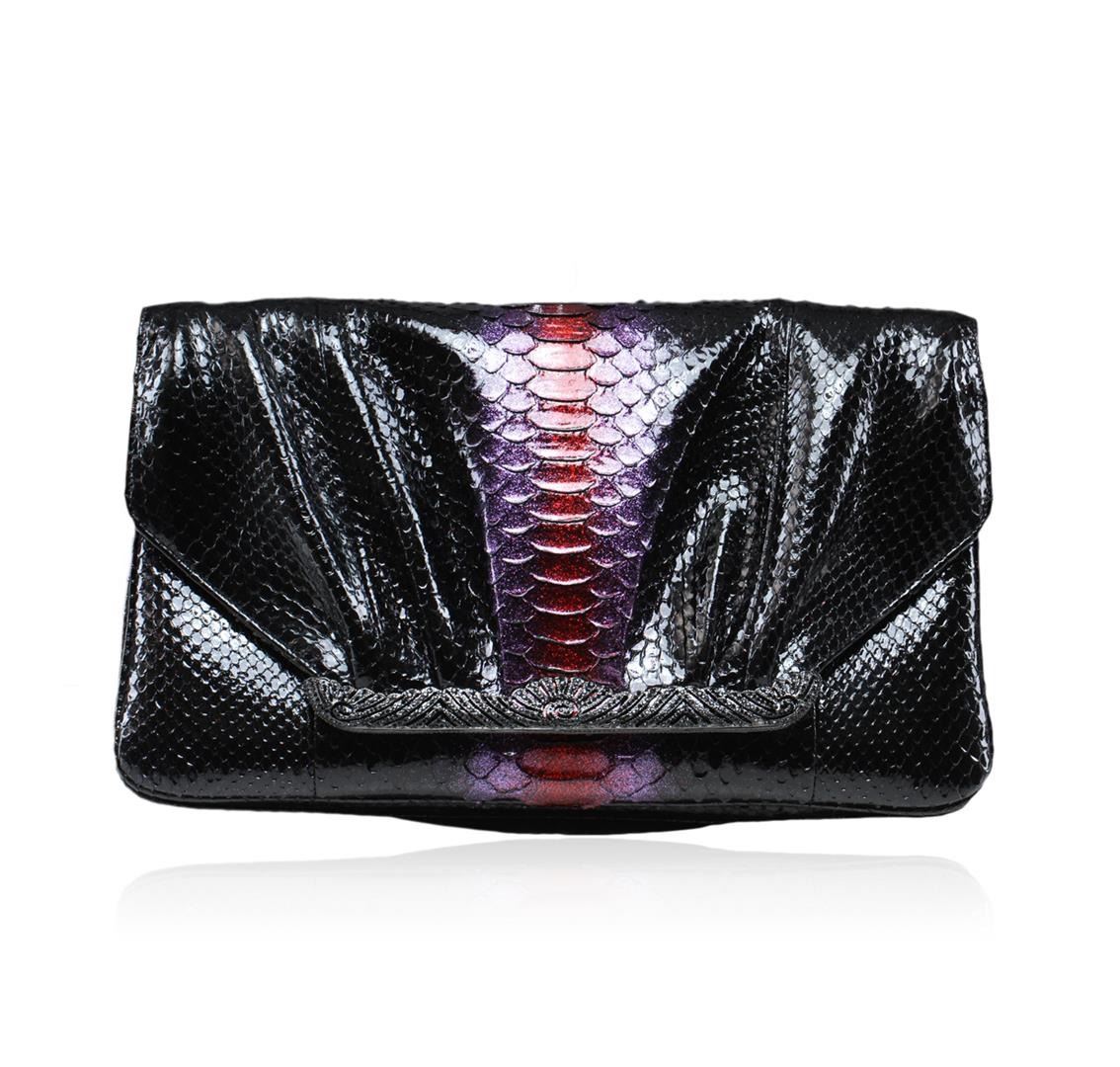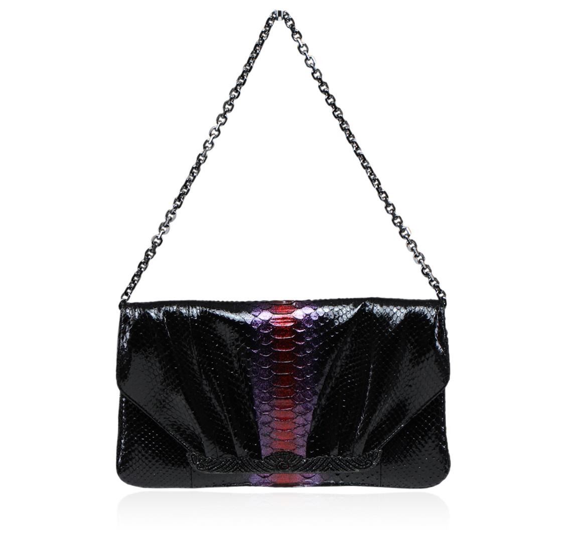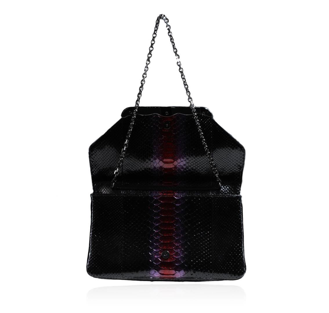 One Judith Leiber Snake Skin Bag hand-crafted by skilled artisans using only the finest quality materials featuring: Red, purple, and black snake; Magnetic snap closure, One interior pocket; Chain like handle. Made in Italy. Comes with dust cover.