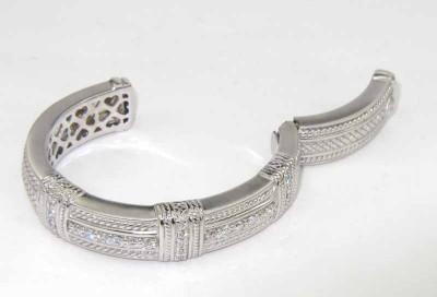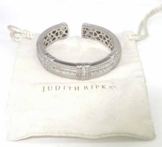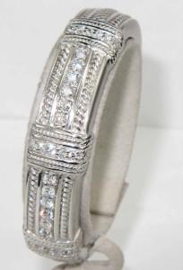 Judith Ripka 18K White Gold, Diamond Bangle With Pouch. The total weight of Bangle is 82.3 grams. The total weight of diamond is 2.43 cts. approximately, G color VVS clarity. There are 27 round diamonds on bangle. The size of Bangle is 48 x 40 mm, the surface is 12 mm wide and 6 mm in thickness.
