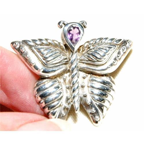 This wonderful Judith Ripka heavy sterling butterfly pin with a faceted authentic amethyst gem stone is in excellent condition. There is dark patina which will polish up easily. I like the look of the old patina. However if you want it polished up nice and shiny, I will be happy to do that for you upon purchase at no additional charge.