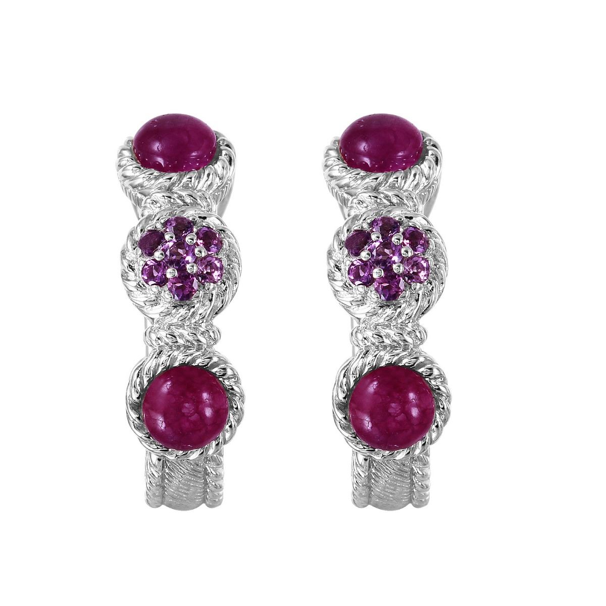 One pair stamped & tested 925 silver ladies combination cast & assembled amethyst hoop earrings with Omega clip backs with posts with a bright polish finish. Hoop earrings measure 23.00.mm x 7.50mm. Trademark is JUDITH RIPKA. Identified with markings of "925". Containing: Four bezel set cabochon cabochon cut natural amethysts, measuring 5.00 x 5.00 x 3.25mm, approximate total weight of 2.32ct., clarity is eye clean, type II, medium, moderately strong, purple color,cut is very good. Fourteen prong set round standard brilliant cut natural amethysts, measuring 1.70 - 1.70 x 1.11 mm, approximate total weight of 0.28ct., clarity is eye clean, type II, medium, moderately strong, purple color,cut is excellent. Approximate Total Weight of Colored Stones 2.60ct. Total Weight of Hoop Earrings 11.60gm. The descriptions listed should not be construed as an appraisal. The detail is provided as a guideline for color, clarity, weights and measurements to the best of our ability. We welcome inspections. WE SHIP WORLDWIDE!