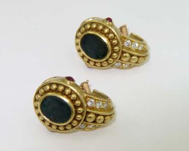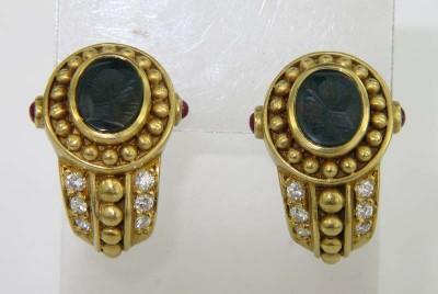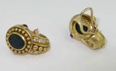 Judith Ripka 18K Yellow Gold, Diamond, Ruby, Colored Stone Intaglio Earrings. The total earrings weight is 22 grams. Total weight of diamond : 0.6 cts. approximately. G color, VS clarity. Total weight of cabochon Ruby : 02 cts. approximately. The size of the Colored Stone : 8 x 10 mm. The earring size: 25 x 18 mm and 9 mm in thickness.