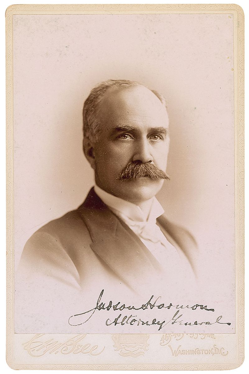 Politician who served as attorney general under Grover Cleveland (1846–1927). Original 4.25 x 6.5 cabinet photo by C. M. Bell of Washington, signed at the bottom of the image in black ink, “Judson Harmon, Attorney General.” In fine condition.