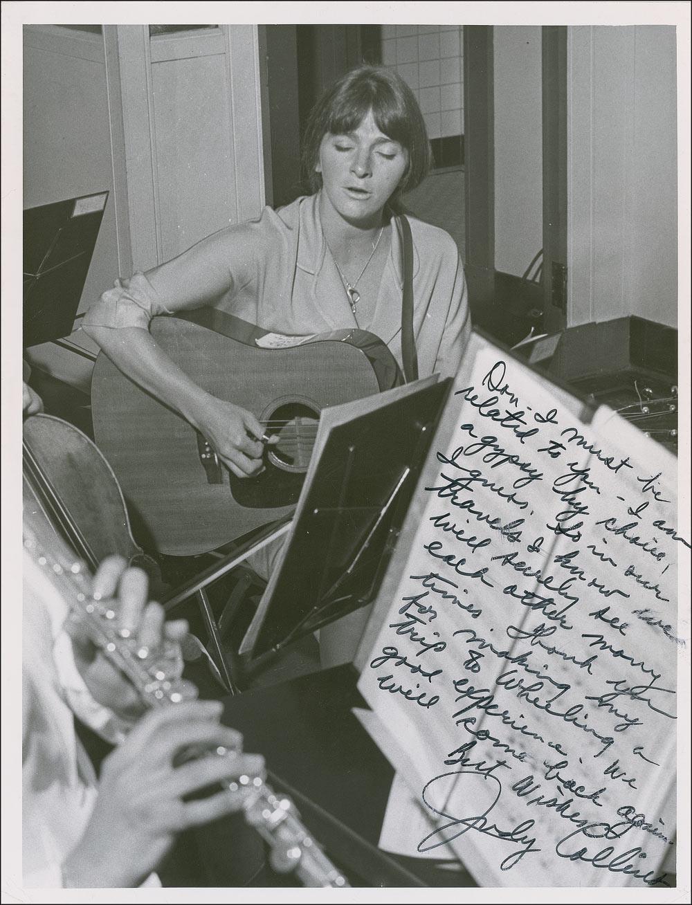 Glossy 7 x 9 photo, signed and inscribed in black felt tip “Don–I must be related to you - I am a gypsy by choice, I guess. So in our travels I know we will surely see each other many times. Thank you for making my trip to Wheeling a good experience. We will come back again. Best wishes, Judy Collins.” Scattered light creases and surface marks, and a couple brushes to inscription, otherwise fine condition.