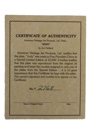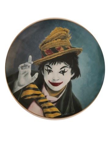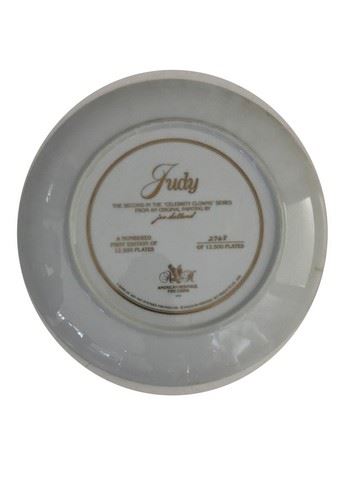 This is a limited edition collectible plate featuring celebrity clowns series from an original painting by John Helland. This particular plate is named Judy and is a numbered first edition of 12,500 plates. It is number 2768. From American Heritage fine China. This is one of four celebrity cloud plates in this collection. Comes with a certificate of authenticity and brochure.