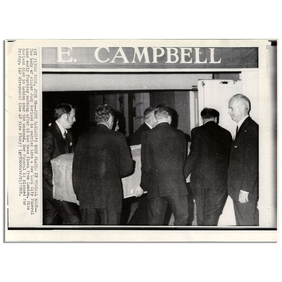Official Associated Press wire photo of Judy Garland's casket being carried by her pallbearers, dated 30 June 1969, from New York. Garland died of an accidental drug overdose at age 47 and was survived by children Liza Minnelli, Lorna Luft and Joey Luft. Associated Press caption reads in part: ''…The body of singer Judy Garland is carried into a New York City funeral home early Thursday morning after it had been flown from London…'' Glossy black and white photo measures 11'' x 8''. Near fine.