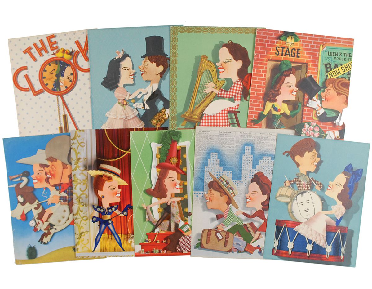 Nine printed color promotional caricatures of Garland designed by Jacques Kapralik, for the films Andy Hardy Meets Debutante, Strike Up the Band, Little Nellie Kelly, Babes On Broadway, Life Begins for Andy Hardy, For Me and My Gal, Presenting Lily Mars, Girl Crazy, and The Clock. Various small creases and tears, otherwise overall fine condition.