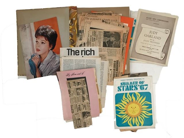 A beautiful scrapbook collection of Newspaper clippings and publications showcasing Judy Garland‘s Hollywood life. There are so many clippings that not all of them made it onto a page in the book and are contained in the front of the book.
