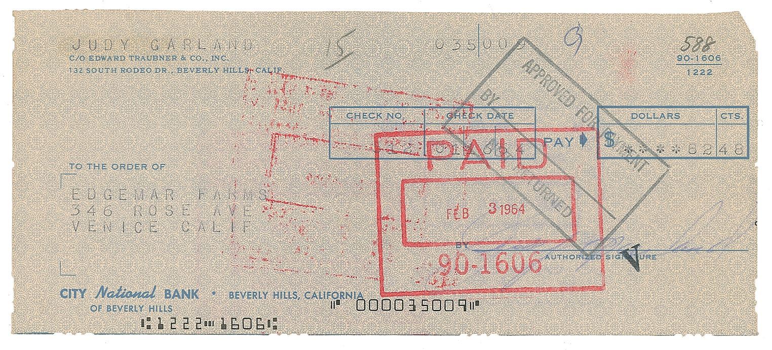 Personal bank check, 7.25 x 3.25, filled out in type and signed by Judy Garland, payable to Edgemar Farms for $82.48, January 16, 1964. In fine condition, with the signature light but legible.