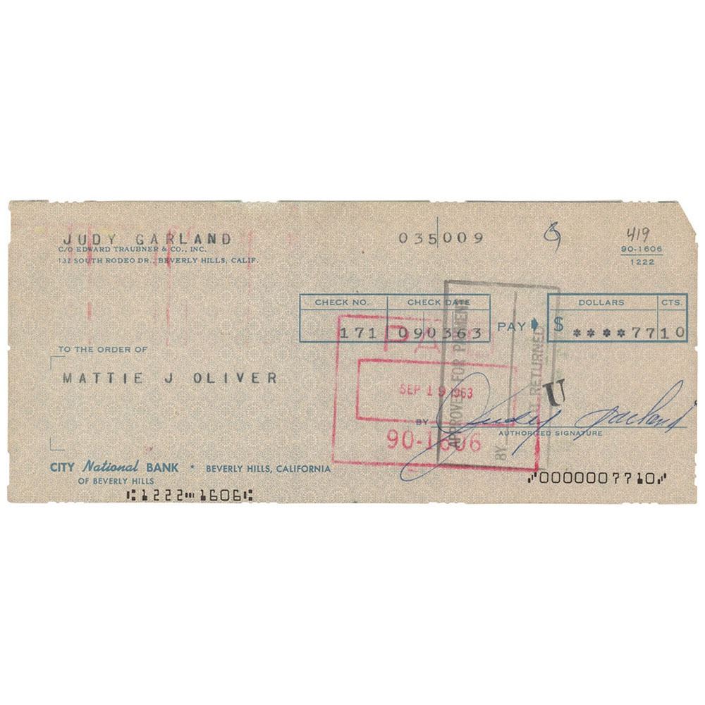 Personal check, 7.5 x 3.25, filled out in type and signed by Judy Garland, payable to her housekeeper Mattie J. Oliver for $77.10, September 3, 1963. In fine condition.