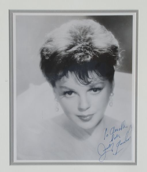 Sublime glossy 7.75 x 9.5 portrait of the incredibly talented and beautiful Garland, bathed in white chiffon and light, her only adornment pearl earrings, signed and inscribed in fountain pen, “To Gerald, love, Judy Garland.” Double-matted and framed to an overall size of 11.25 x 13.5. In fine condition, with a small tear to the left border. An extraordinary photo with a dark, bold signature, signed during the era of the short-lived Judy Garland Show.