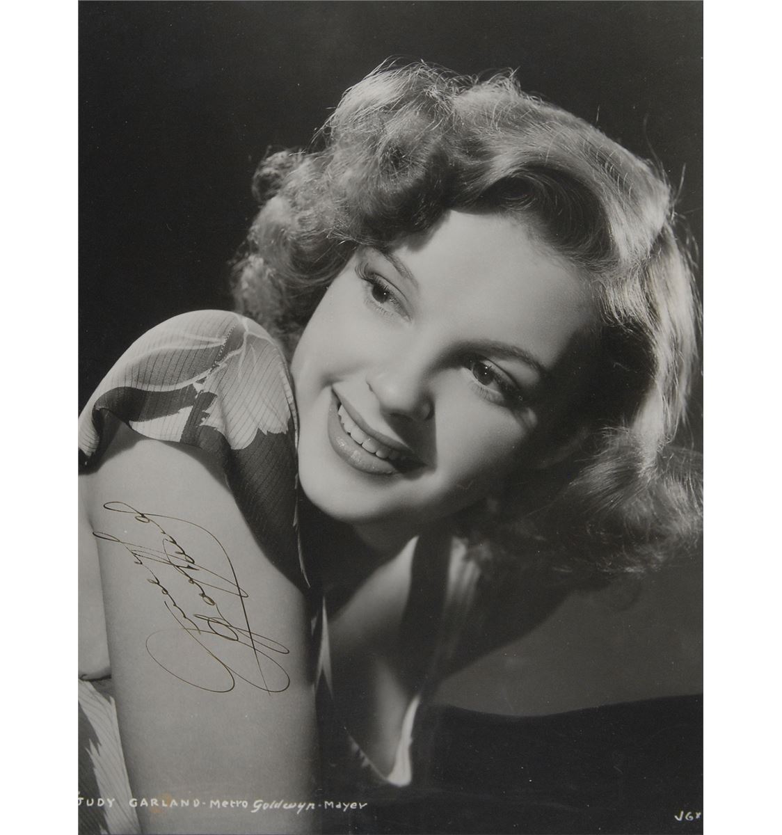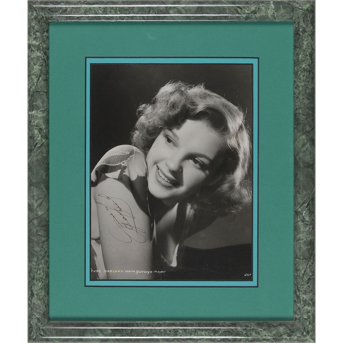 Vintage glossy 6.75 x 9 Metro-Goldwyn-Mayer publicity photo of a radiant Garland, signed vertically in fountain pen. The autograph appears to be an in-person example, circa early 1940s. In fine condition, with a few unobtrusive emulsion cracks to left side of her face, and slight scattered surface impressions (all visible only at an angle). Double-matted and framed to an overall size of 12 x 14.5. A beautiful, uninscribed example of the prolific actress and singer, made especially desirable by the bold signature and uncommon pose. Accompanied by a full letter of authenticity from PSA/DNA. The James Collings Collection.