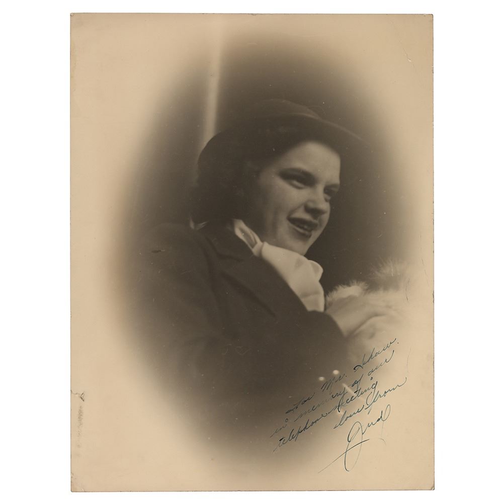 Nice oversized vintage matte-finish 10.25 x 13.75 photo of the youthful Garland in an oval vignette, signed and inscribed in fountain pen, "For Mr. Shaw, in memory of our telephone meeting, love from Judy.” In very good to fine condition, with some creasing to the right side and the corners, and a short tear to the left edge.