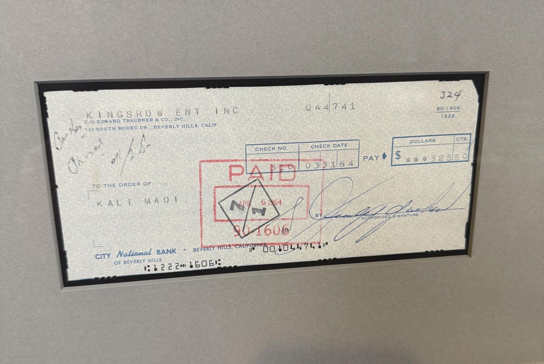 Signed check issued to Jazz Drummer Kali Madi, 31 March 1964. 14 1/2" by 22" framed.