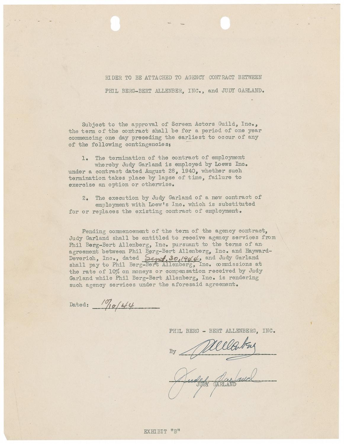 DS, signed “Judy Garland,” one page, 8.5 x 11, October 10, 1944. A rider to an agency contract between the actress and Phil Berg and Bert Allenberg. In part: “The execution by Judy Garland of a new contract of employment with Loew’s Inc. which is substituted for or replaces the existing contract of employment…Judy Garland shall pay to Phil Berg-Bert Allenberg, Inc. commissions at the rate of 10% on moneys or compensation received by Judy Garland.” Punch and staple holes to top edge, scattered light toning and soiling, and scattered light creasing with a diagonal crease crossing through her last name, otherwise fine condition. On the day Judy signed this document, Garland had a day off from filming The Clock. The following month, one of her most successful MGM films—Meet Me in St. Louis—would be released.