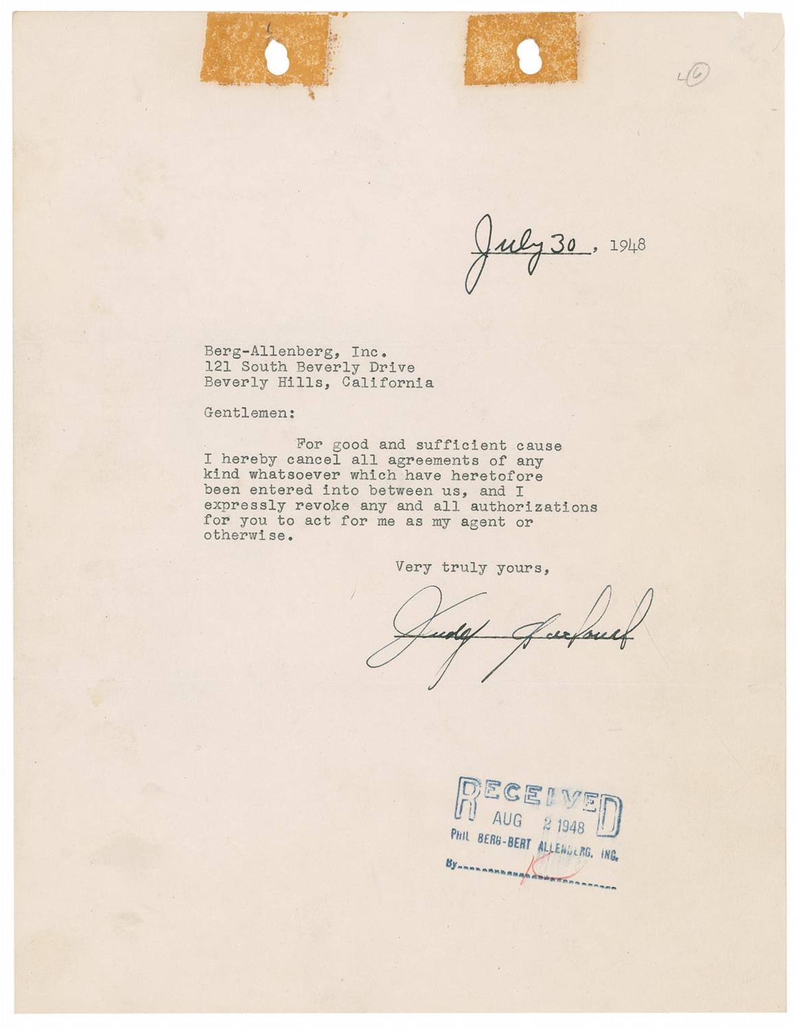 TLS, one page, 8.5 x 11, July 30, 1948. Garland ends her relationship with Berg-Allenberg, Inc. of Beverly Hills. In full: “For good and sufficient cause I hereby cancel all agreements of any kind whatsoever which have heretofore been entered into between us, and I expressly revoke any and all authorizations for you to act for me as my agent or otherwise.” Two filing punch holes and heavy tape staining at the top of the page, and an office stamp at the bottom of the page, otherwise fine condition. The few flaws can easily be matted out if so desired to create a highly presentable display piece!