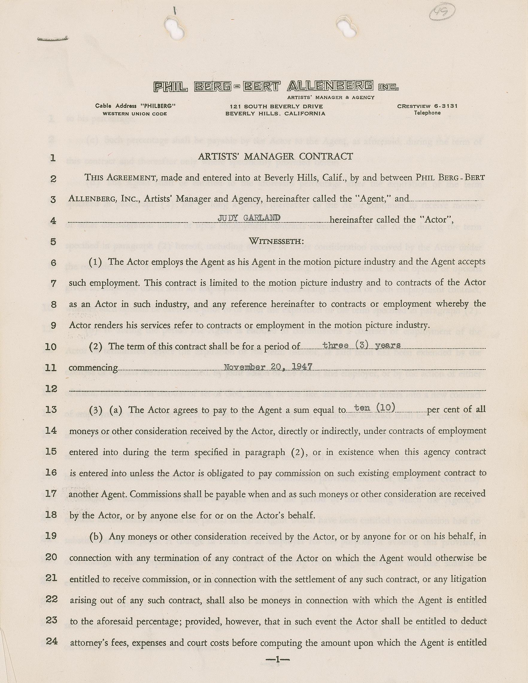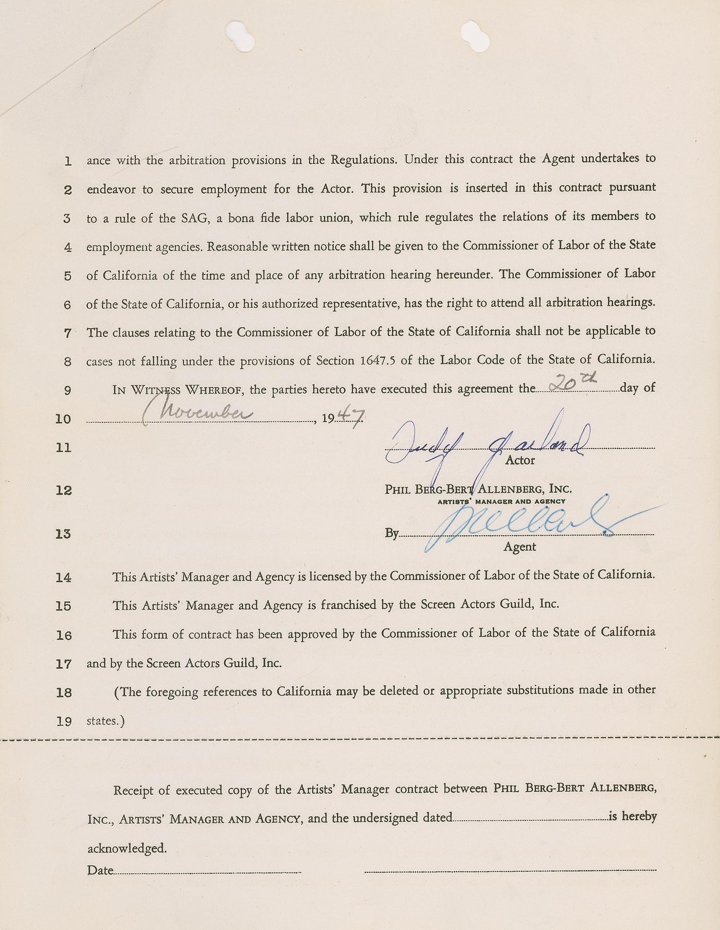 DS, signed “Judy Garland,” eight pages, 8.5 x 11, November 20, 1947. Agreement between the actress and Phil Berg-Bert Allenberg, Inc. In part: “The Actor employs the Agent as his Agent in the motion picture industry and the Agent accepts such employment…The term of this contract shall be for a period of three (3) years commencing November 20, 1947…The Actor agrees to pay to the Agent a sum equal to ten (10) per cent of all moneys or other consideration received by the Actor.” A couple corner creases, staple at top left corner, two sets of filing punch holes at the top, and a small pencil notation, otherwise fine condition. This contract was drawn mere months after Garland’s first suicide attempt in July of 1947, and only eight months later, her relationship with Berg-Bert Allenberg came to a screeching halt after she proved unable to complete the filming of Barkleys of Broadway. She would make her triumphant return in the aptly-titled 1954 hit, A Star Is Born. This document represents Berg-Bert Allenberg’s last effort to retain their beloved, tumbling star.