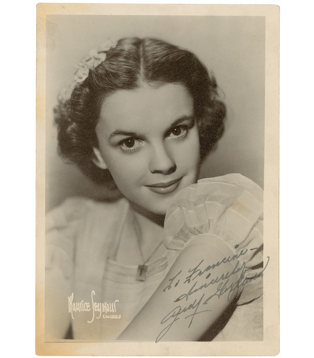 Vintage matte-finish 5 x 7 Maurice Seymour photo, signed and inscribed in fountain pen “To Francine, Sincerely, Judy Garland.” Some mild bends and ripples, a couple of corner creases, and some light toning and discoloration to left corners, otherwise fine condition. Consignor indicates signature was acquired by her mother backstage at the Chicago Theater, where she worked as a chorus girl, and met Garland in 1936–37.