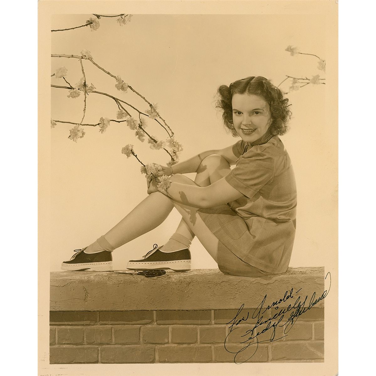 Charming vintage sepia matte-finish 8 x 10 photo of a young Garland seated atop a brick wall, signed and inscribed in fountain pen “For Arnold, Sincerely, Judy Garland.” Mild rippling along top edge, a couple light creases to background, and some trivial soiling to lower left border, otherwise fine condition. An early and inviting image boasting an exceptionally bold and crisp signature.