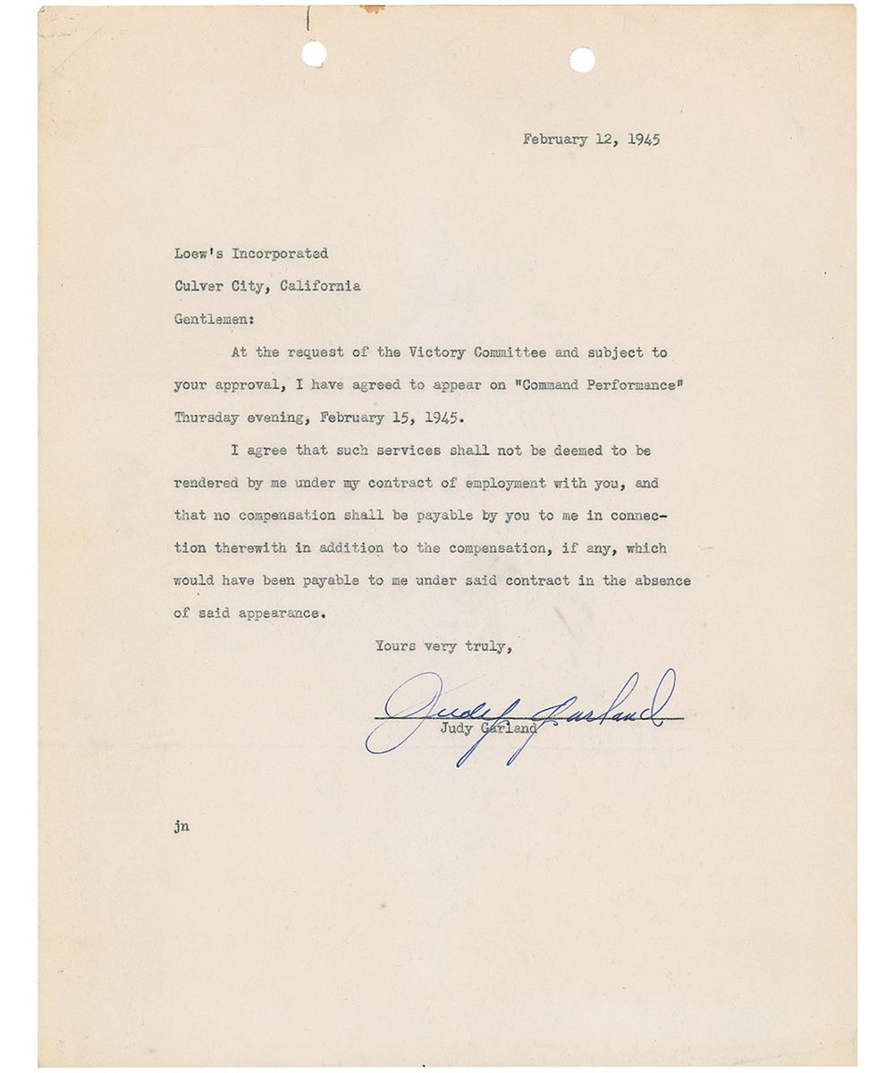 DS, one onionskin page, 8.5 x 11, February 12, 1945. Letter to Loew’s Incorporated agreeing to work for free for the war effort. In full: “At the request of the Victory Committee and subject to your approval, I have agreed to appear on 'Command Performance' Thursday evening, February 15, 1945. I agree that such services shall not be deemed to be rendered by me under my contract of employment with you, and that no compensation shall be payable by you to me in connection therewith in addition to the compensation, if any, which would have been payable to me under said contract in the absence of said appearance.” In fine condition, with scattered creasing and wrinkling throughout, staple holes and two punch holes to the top, and a stray ink mark and spot of soiling to the top edge. Command Performance was a radio show broadcast to military bases in the US and overseas via shortwave radio. Many top celebrities and performers appeared on it in an effort to boost morale among the troops. Garland appeared on the show numerous times, including February 15, along with Frank Sinatra and Frank Morgan. She performed two songs, a parody of ‘Over the Rainbow’ called ‘Somewhere Over the Barrel’ and ‘I'm Gonna Be Strong for You’ (with Bob Hope).
