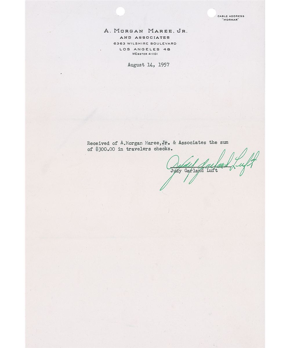 DS, signed “Judy Garland Luft,” one page, 7.25 x 10.5, August 14, 1957. Garland signs for traveler’s checks from A. Morgan Maree, Jr. In full, “Received of A. Morgan Maree, Jr. and Associates the sum of $300.00 in traveler’s checks.” Nicely signed at the conclusion by Garland, using her married name. In fine condition.