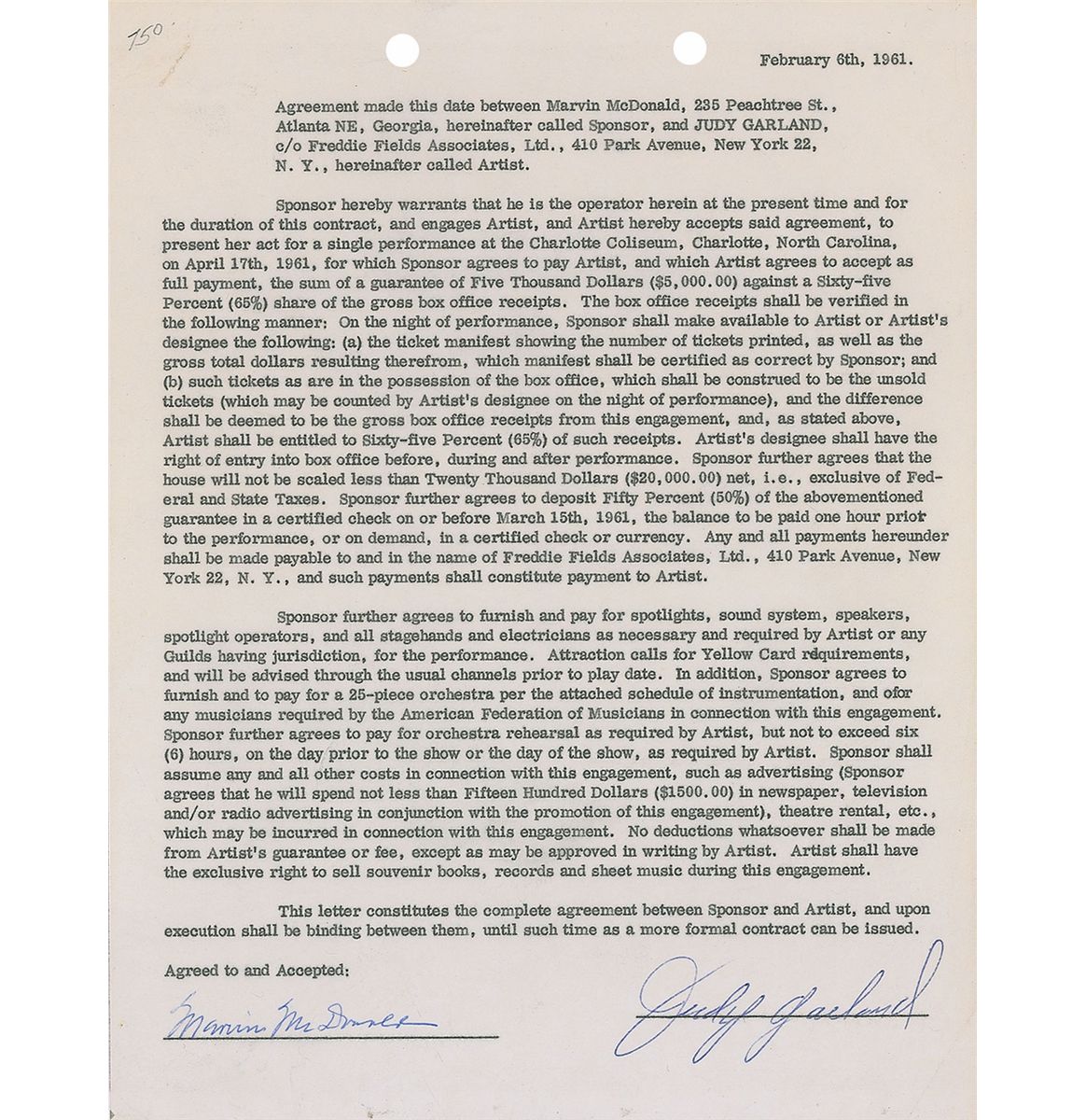 DS, two pages, 8.5 x 11, February 6, 1961. Agreement between Garland and Marvin McDonald for her to “present her act for a single performance at the Charlotte Coliseum, Charlotte, North Carolina, on April 17, 1961.” In fine condition, with expected document wear.