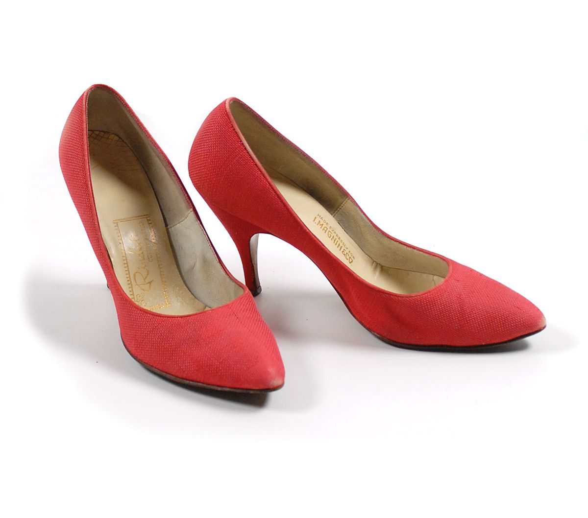 A pair of Garland’s personally-owned and -worn dress shoes. Pinkish-red high heels, size 5 1/2B, are stamped “Rinaldi Custom Bottier,” on one insole, and “Made Expressley for I. Magnin & Co.,” on the other, with 4? heels. In fine condition, with expected light wear to the toe, insole, and sole. Accompanied by photocopied pages from the 1978 Garland auction by C. B. Charles’s Galleries, as well as a photocopy of an admission ticket to the auction. Provenance: C. B. Charles’s Galleries; The Judy Garland Auction, November 27, 1978, item number 113E.