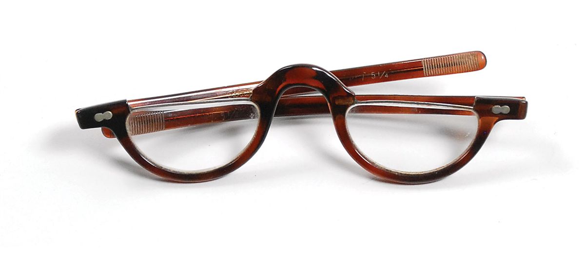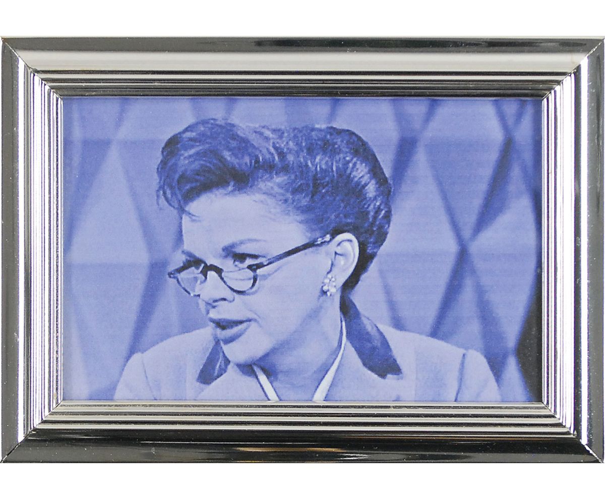 A pair of Garland’s personally-owned and screen-worn reading glasses. Brown half-lens glasses are by Kobley and Stern, which is printed on the inside of one of the temples, are fitted with prescription half lenses, and were worn by Garland on an episode of The Judy Garland Show during a sketch with Bob Newhart. Accompanied by a printed screen grab of Garland in the glasses. Accompanied by photocopied pages from the 1978 Garland auction by C. B. Charles’s Galleries, as well as an original admission ticket to the auction. Provenance: C. B. Charles’s Galleries; The Judy Garland Auction, November 27, 1978. Screen-worn items from any point in Garland’s career are highly sought after by collectors.