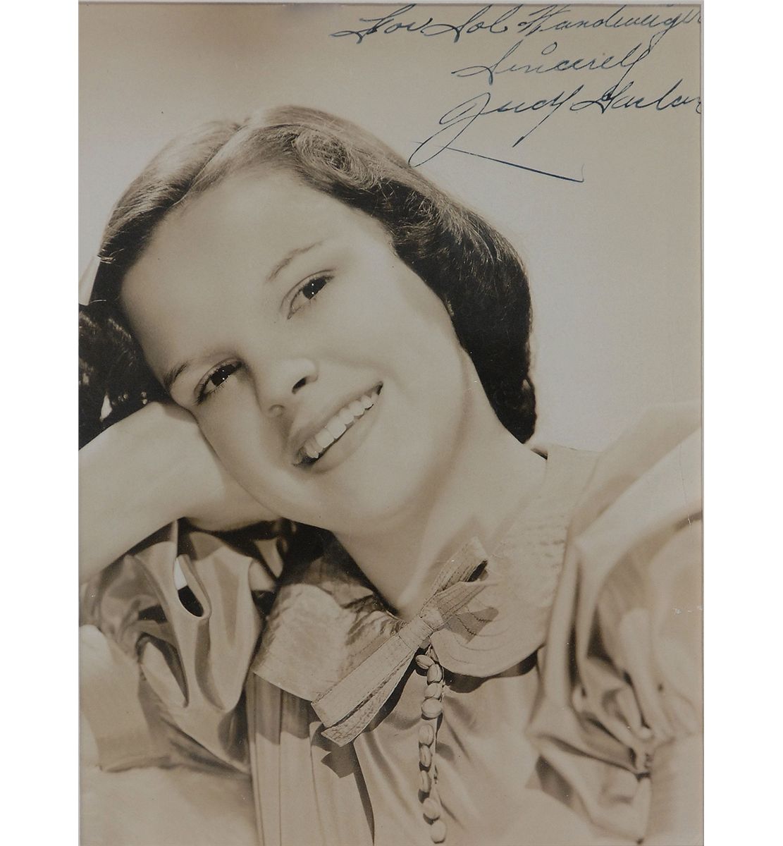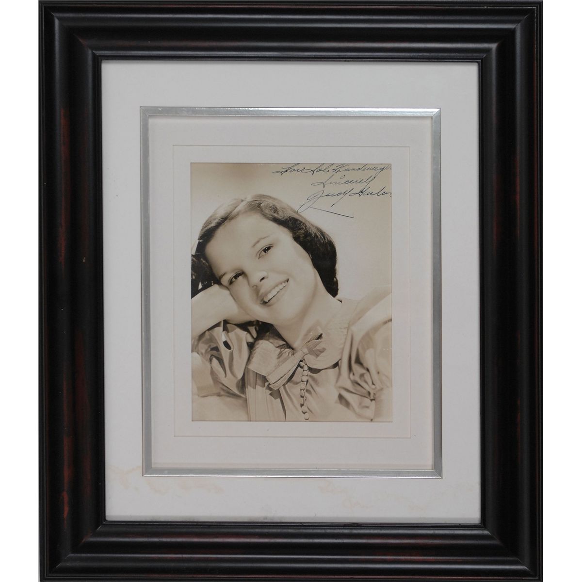 Early vintage glossy 5.5 x 7.5 photo of a young Garland resting her head in her hand, circa 1937–1938, signed and inscribed in fountain pen, “For Sol Handwright, Sincerely, Judy Garland.” Triple-matted and framed to an overall size of 14.5 x 17.5. In very good condition, with several noticeable creases, some passing through parts of image, with one passing through just a single letter of signature.