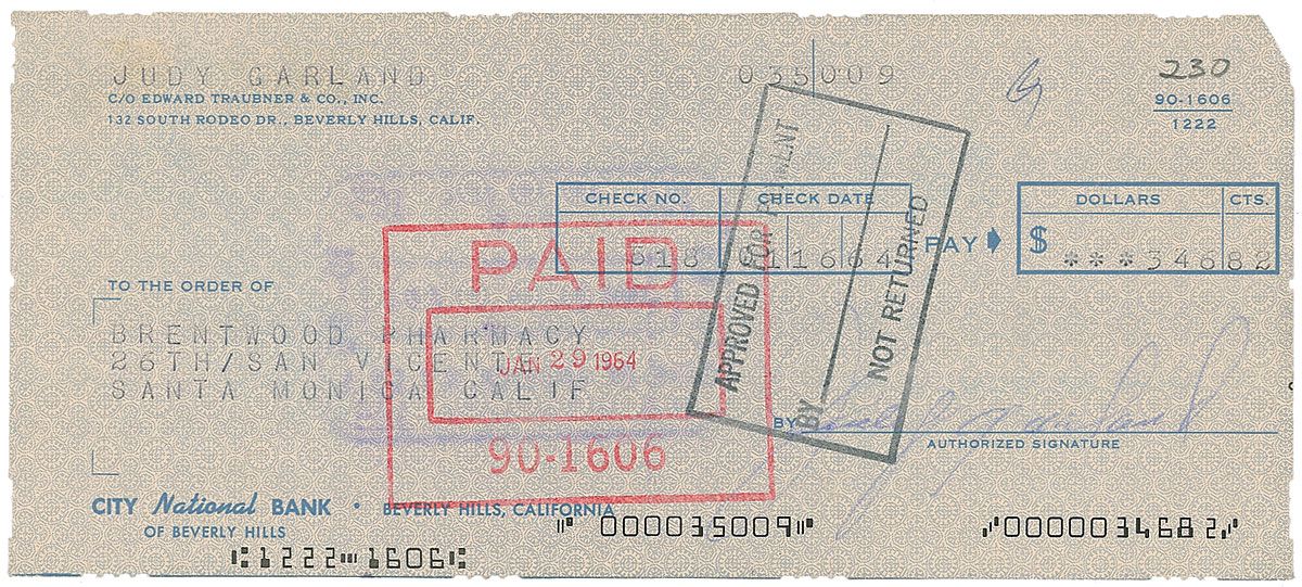 Personal check, 7.25 x 3, filled out in type and signed by Garland, payable to Brentwood Pharmacy for $346.68, January 16, 1964. In fine condition, with bank stamp over first name of signature, and Garland’s signature a shade or two light.