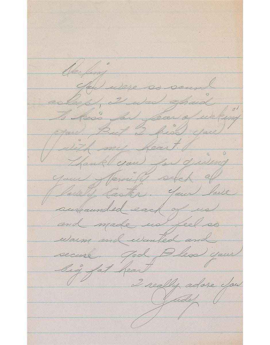 ALS signed “Judy,” one page, lightly-lined, 5 x 8, no date. Love letter to her husband Sidney Luft. In full: “You were so sound asleep, I was afraid to kiss for fear of waking you. But I kiss you with my heart. Thank you for giving your family such a lovely Easter. Your love surrounded each of us and made us feel so warm and wanted and secure. God bless your big fat heart. I really adore you.” In fine condition, with some mild toning along edges. Luft and Garland married in 1952, his second and her third, and they had two children together. Luft is credited for keeping Garland working in television and concerts, and for setting the stage for Garland’s comeback film, A Star Is Born, by securing financing and facilities from Warner Bros. A heartfelt and playful letter from the couple’s happier times together.