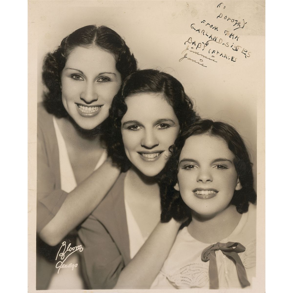 Fabulous, one-of-a-kind, extremely early vintage pearl-finish 8 x 9.75 photo, circa 1934, of the three Garland sisters by Bloom of Chicago, signed and inscribed in fountain pen by Garland “To Dorothy from the Garland Sistes [sic], Baby Frances,” and also signed by her sisters “Jimmie,” and “Janie.” In very good to fine condition, with scattered creases, mild rippling along top edge, soiling over beginning portion of inscription, as well as a couple of minor spots, and some light silvering and surface impressions.