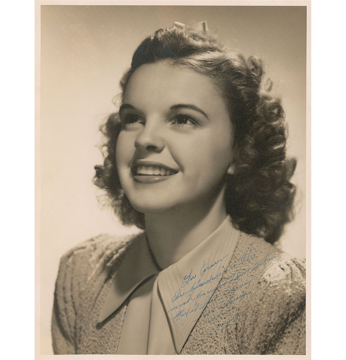 Lovely vintage matte-finish 10 x 13 photo of Garland looking skyward, signed and inscribed in blue ink to pianist, comedian, and composer Oscar Levant, “For Oscar—Our friendship is the most precious thing I have. May it last forever. Love always, Yours, Judy.” In fine condition, with some light contrast to closing of inscription and signature, and a bit of scattered light silvering. Accompanied by the original Sotheby Parke Bernet mailing envelope. Garland met Levant in 1938 and quickly became enamoured with him. Although their relationship never progressed past friendship, they would share their deepest feelings including those about stage fright and other trying experiences. A magnificent photo between two performers who shared many of their emotional troubles.