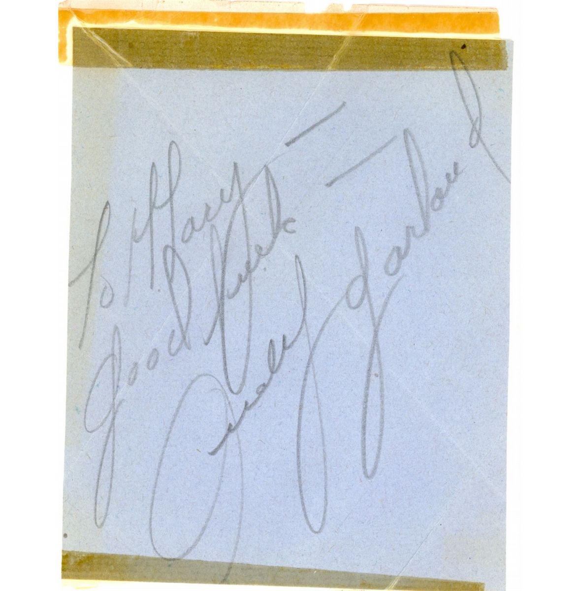 "To Larry Good Luck Judy Garland". Does have some tape slightly touching to letters in her signature. "To Larry Good Luck Judy Garland"