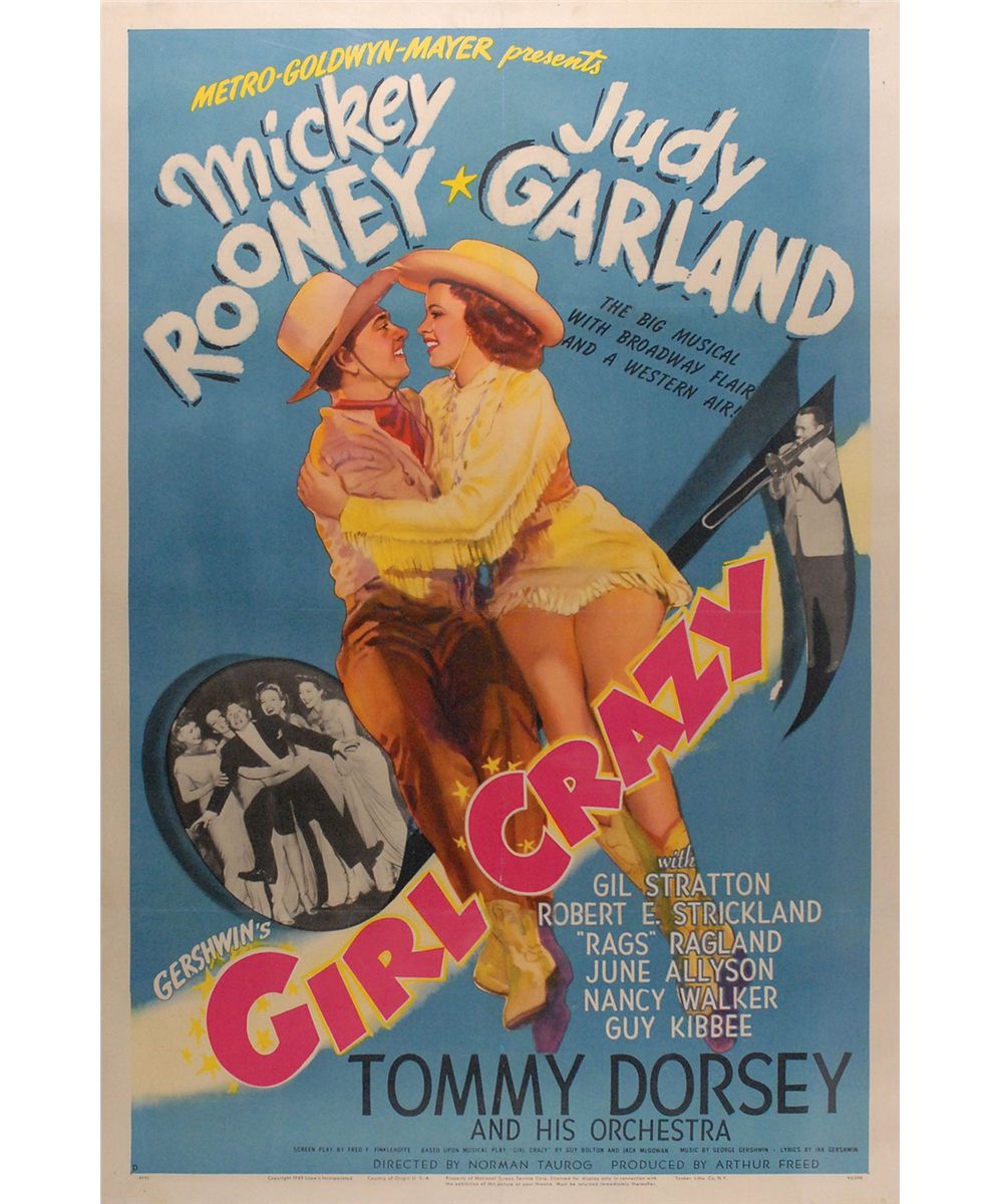 Vibrant original color 27.25 x 41 one-sheet movie poster for the 1943 MGM film Girl Crazy, starring Judy Garland and Mickey Rooney. This ‘Style D’ poster features a wonderful image of the pair together, with Tommy Dorsey playing his trombone in the background. Poster has been professionally linen-backed to a slightly larger size. Rolled and in very good condition, with professional restorations and recoloring along intersecting folds. A classic, beautiful image and one of the most sought-after Garland posters.