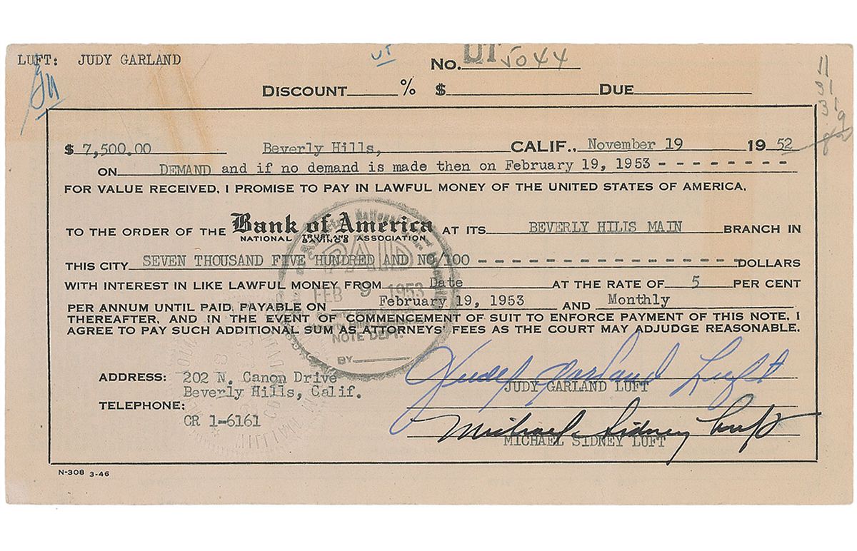 DS, signed “Judy Garland Luft,” one page, 8.25 x 4.5, February 19, 1952. Bank of America promissory note in which Garland agrees to repay a loan of $7500 within the year at an interest rate of 5%. Signed at the conclusion in fountain pen by Garland using her married name, and countersigned by her husband, Michael Sidney Luft. General document wear with intersecting folds, a few areas of toning, and expected cancellation stamps and bank notations, otherwise fine condition.