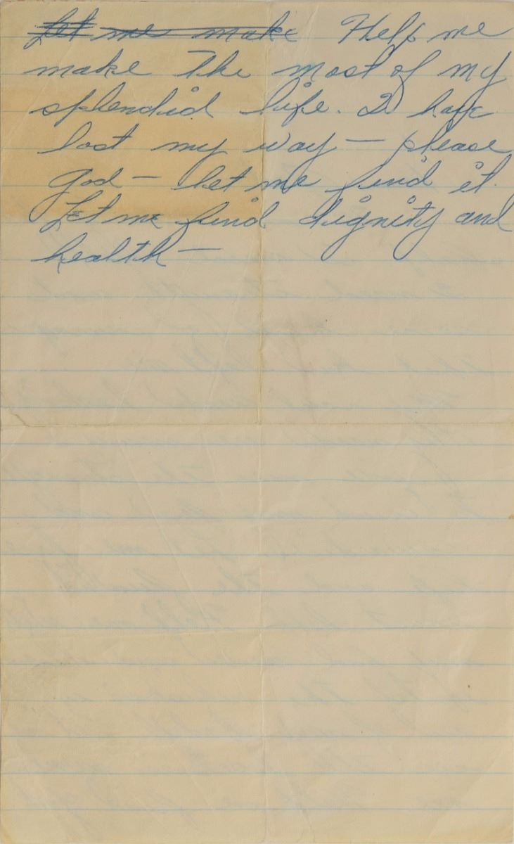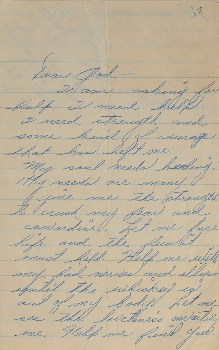 Remarkable handwritten prayer, unsigned, one page both sides, 5 x 8, circa 1958. Garland pens a desperate plea, in full: "Dear God—I am asking for help. I need help. I need strength and some kind of courage that has left me. My soul needs healing. My needs are many. Give me the strength to crush my fear and cowardice. Let me face life and the fun it must hold. Help me with my bad nerves and illness until the whiskey is out of my body. Let me see the loveliness awaiting me. Help me find you. Help me make the most of my splendid life. I have lost my way—please God—let me find it. Let me find some dignity and health." In fine condition, with scattered light creasing and a light block of toning to the upper left back corner.