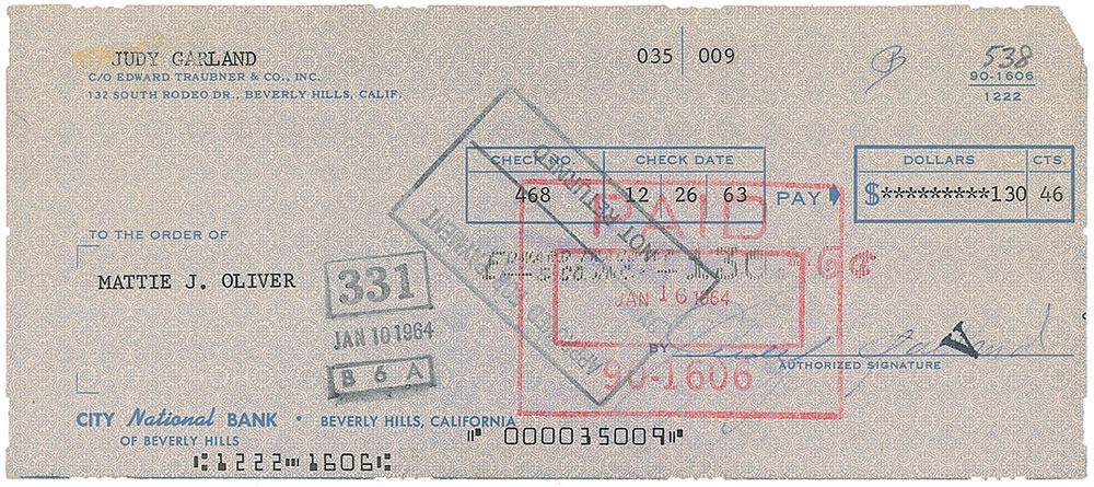 Personal check, 7.25 x 3, filled out in type and signed by Garland, payable to Mattie J. Oliver for $130.46, December 26, 1963. In fine condition, with bank stamps touching the light but legible signature.