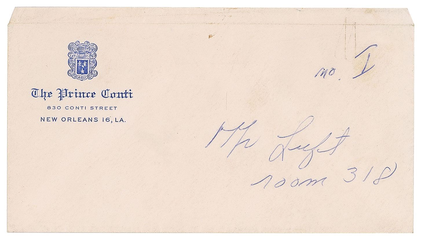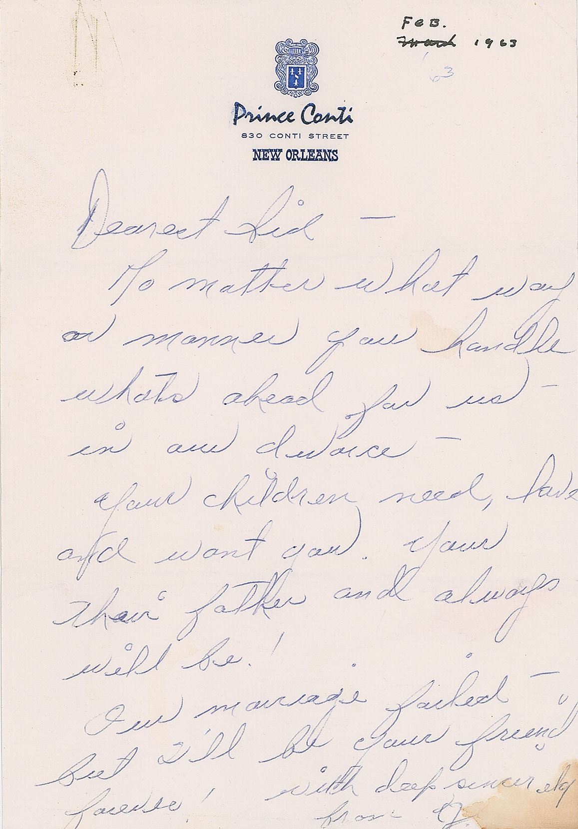 ALS signed “J,” one page, 7.25 x 10.5, Prince Conti letterhead, February 1963. A private letter to her husband Sidney Luft, in full: "No matter what way or manner you handle what's ahead for us—in our divorce—your children need, love and want you. You're their father and always will be! Our marriage failed—but I'll be your friend forever!" In very good to fine condition, with a paperclip impression to the top edge and a stain to the lower right corner. Accompanied by the original envelope addressed in Garland's own hand.