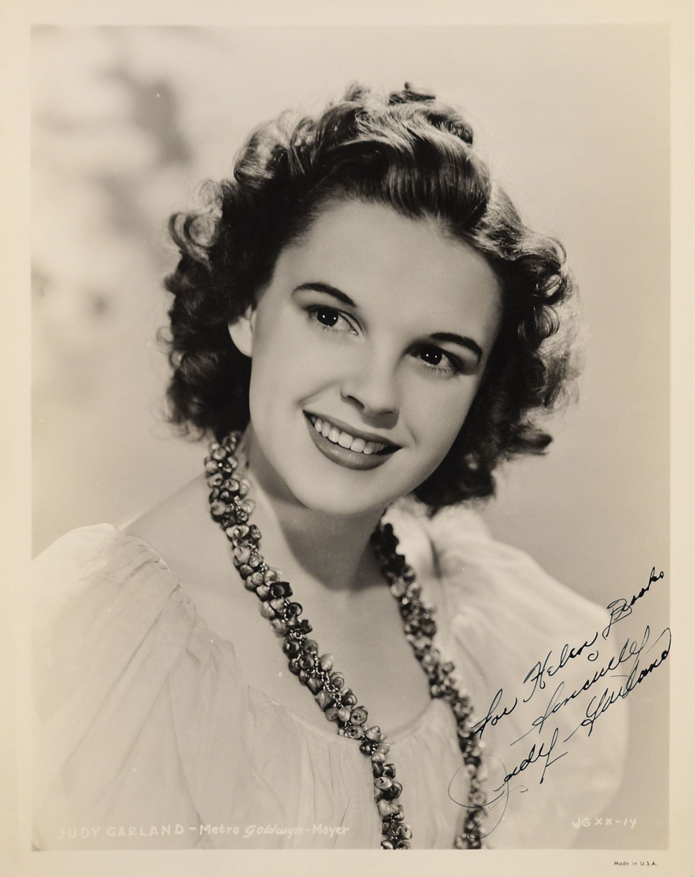 Lovely vintage glossy 8 x 10.25 MGM publicity photo of Garland wearing a seashell necklace, signed and inscribed in fountain pen, "For Helen Brooks, Sincerely, Judy Garland.” In fine condition, with a few small surface creases, and a very faint paperclip impression to the top edge.