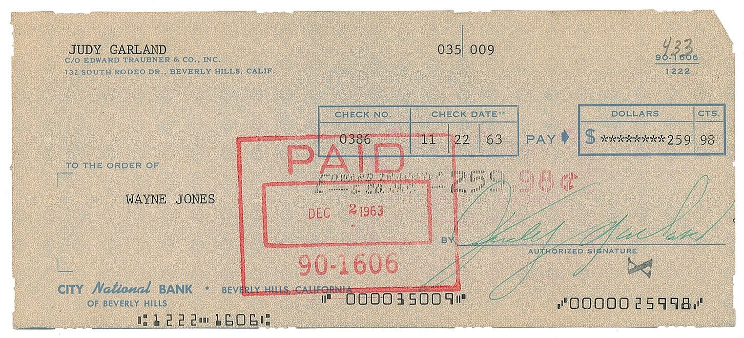 Personal check, 7.5 x 3.25, filled out in type and signed by Garland, payable to Wayne Jones for $259.98, November 22, 1963. In fine condition. Jones was a member of Garland's household staff.