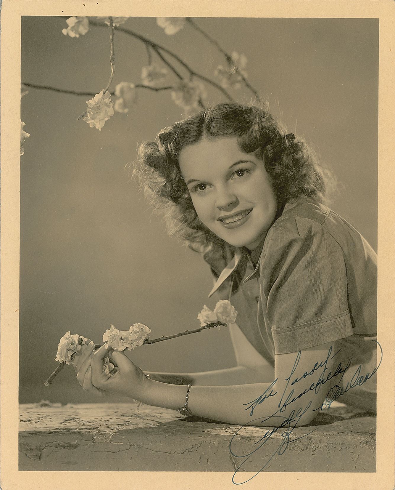 Lovely vintage matte-finish 8 x 10 studio photo of Garland holding a flowered tree branch, signed and inscribed in fountain pen, "For Cassey, sincerely, Judy Garland.” In fine condition, with a light surface stain, visible at an angle, that slightly impinges on her forehead.