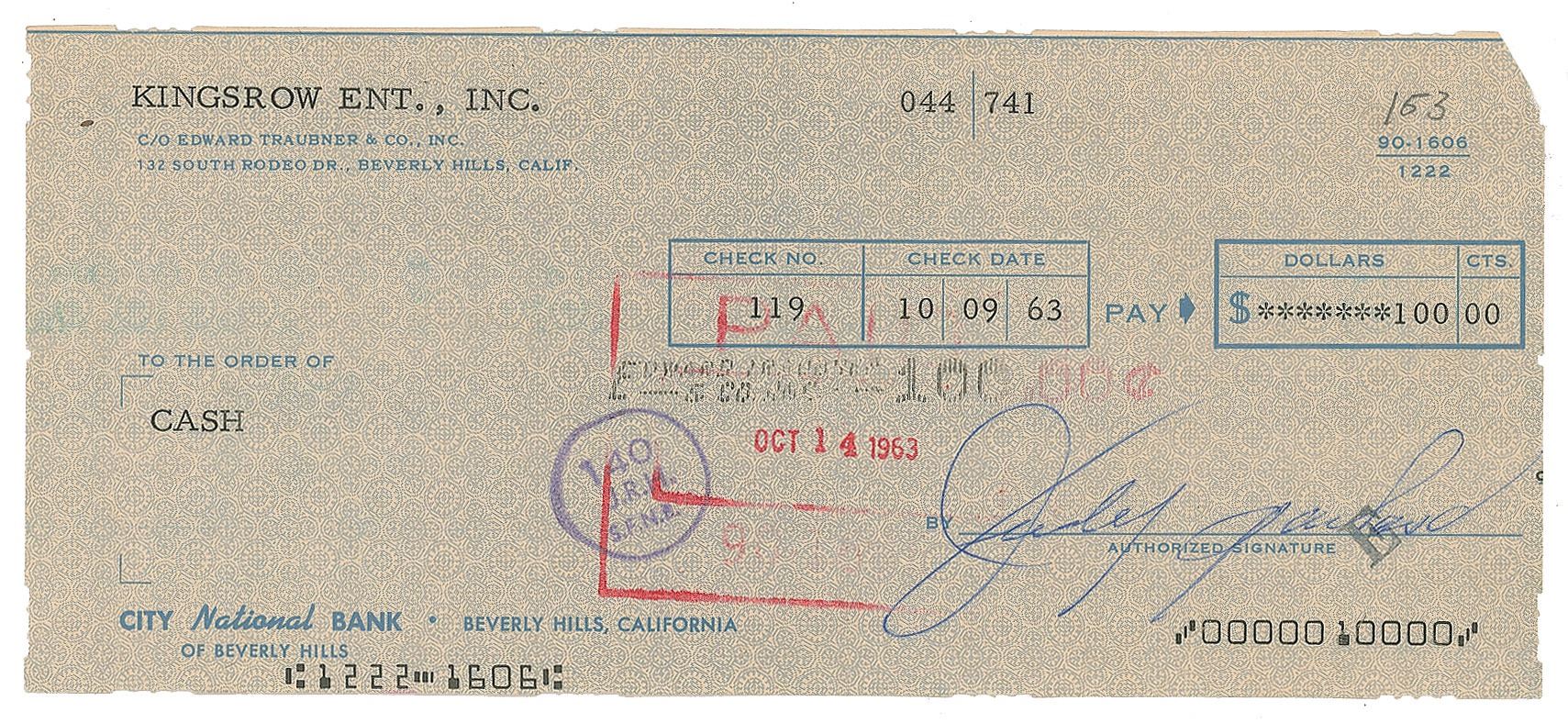 Kingsrow Ent., Inc., personal check, 7.25 x 3.25, filled out in type and signed by Garland, "Judy Garland," payable to Cash for $100, October 9, 1963. In fine condition.